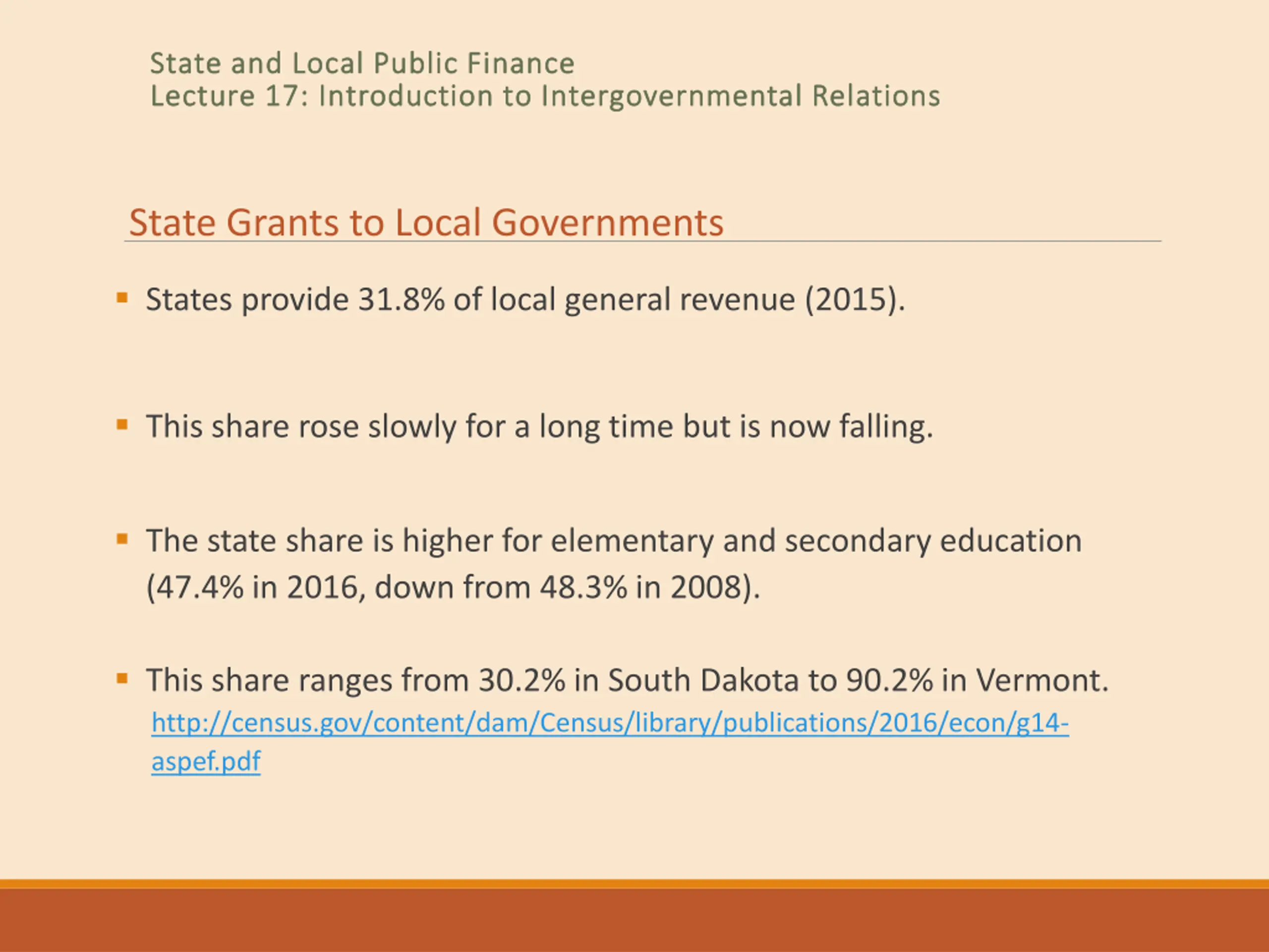 State and Local Public Finance State and Local Public Finance Lecture 17: Introduction to Intergovernmental Relations Lecture 17: Introduction to Intergovernmental Relations State Grants to Local Governments States provide 31.8% of local general revenue (2015). This share rose slowly for a long time but is now falling. The state share is higher for elementary and secondary education (47.4% in 2016, down from 48.3% in 2008). This share ranges from 30.2% in South Dakota to 90.2% in Vermont. http://census.gov/content/dam/Census/library/publications/2016/econ/g14- aspef.pdf