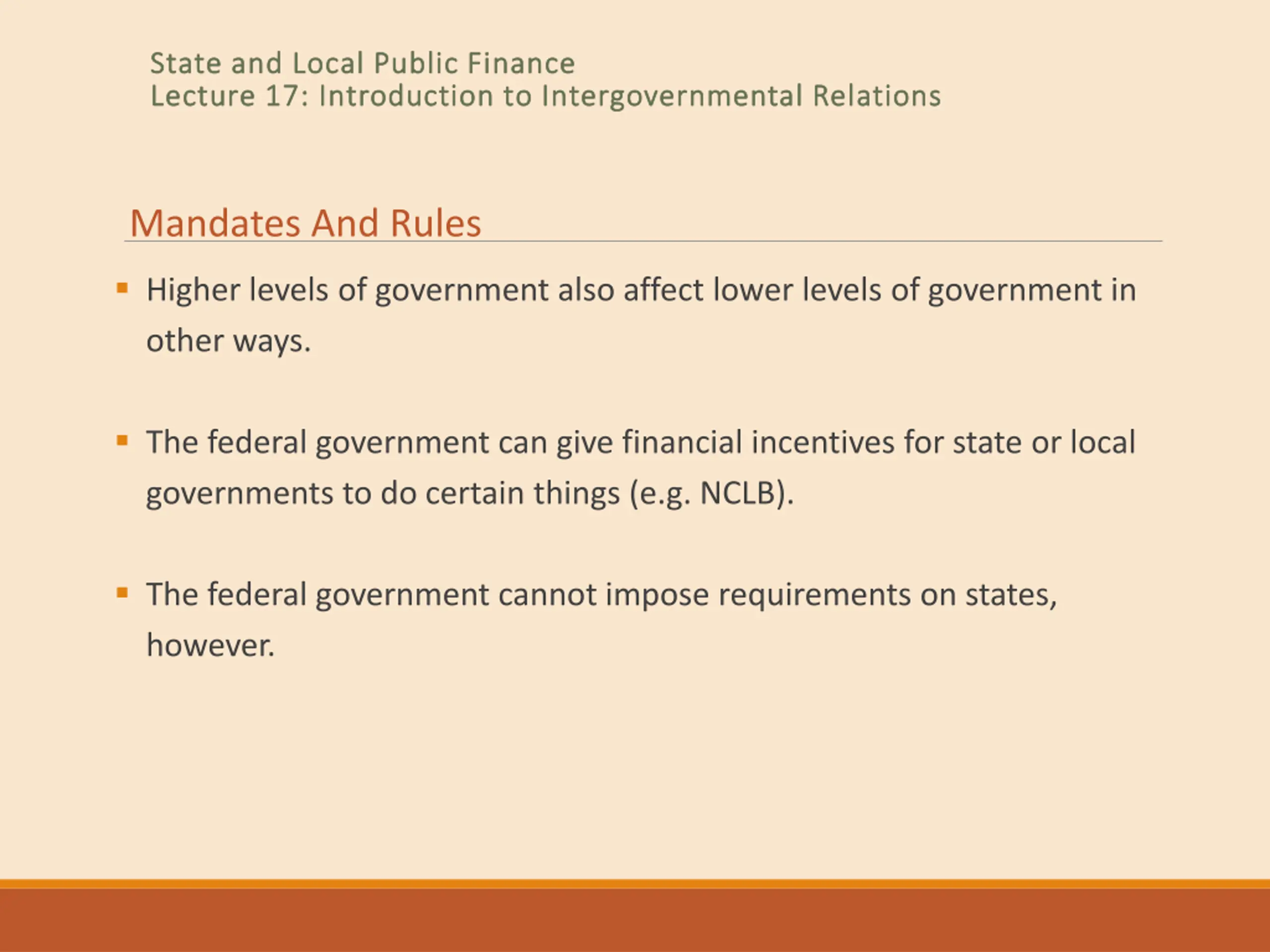 State and Local Public Finance State and Local Public Finance Lecture 17: Introduction to Intergovernmental Relations Lecture 17: Introduction to Intergovernmental Relations Mandates And Rules Higher levels of government also affect lower levels of government in other ways. The federal government can give financial incentives for state or local governments to do certain things (e.g. NCLB). The federal government cannot impose requirements on states, however.