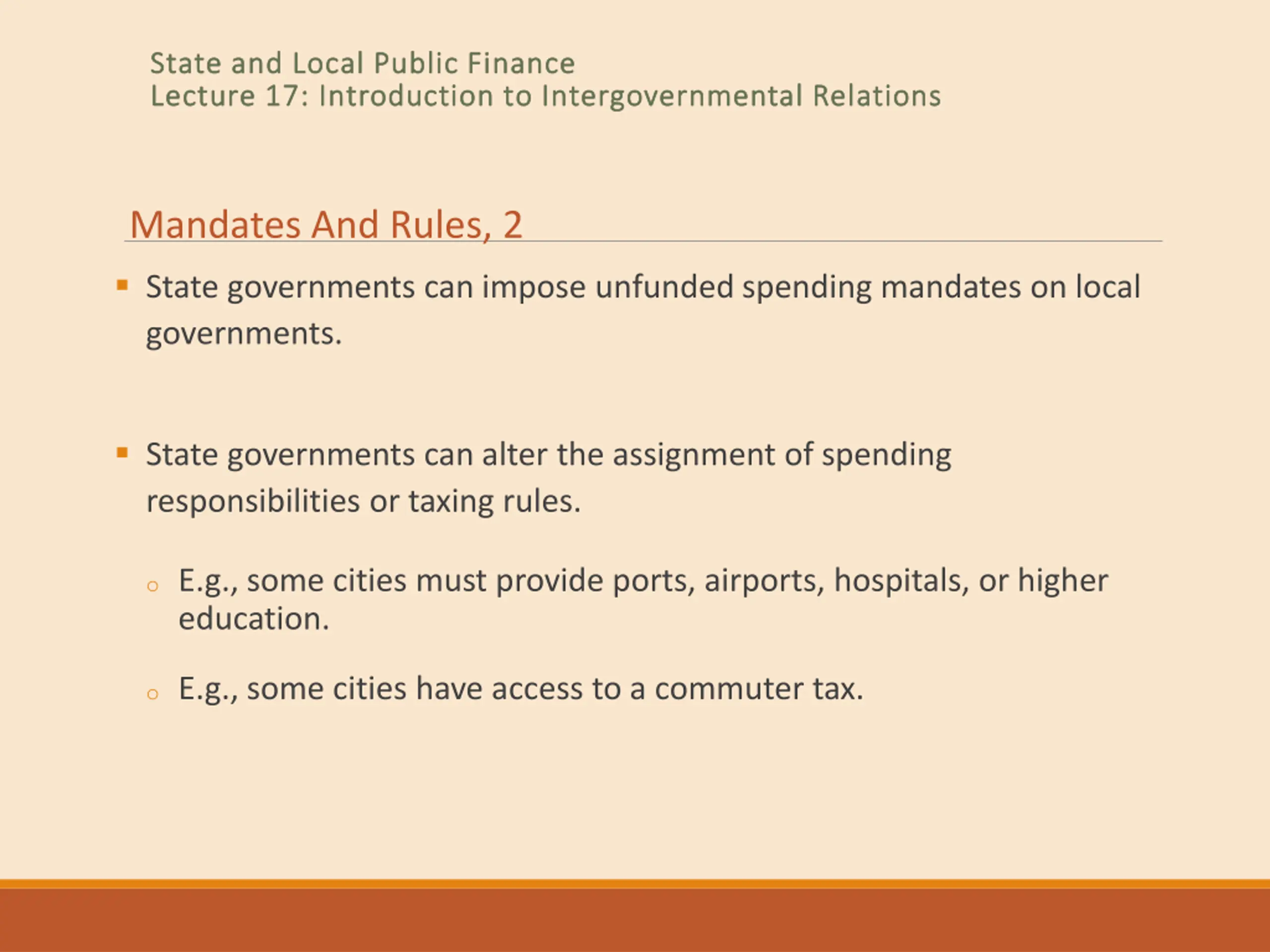 State and Local Public Finance State and Local Public Finance Lecture 17: Introduction to Intergovernmental Relations Lecture 17: Introduction to Intergovernmental Relations Mandates And Rules, 2 State governments can impose unfunded spending mandates on local governments. State governments can alter the assignment of spending responsibilities or taxing rules. o E.g., some cities must provide ports, airports, hospitals, or higher education. o E.g., some cities have access to a commuter tax.