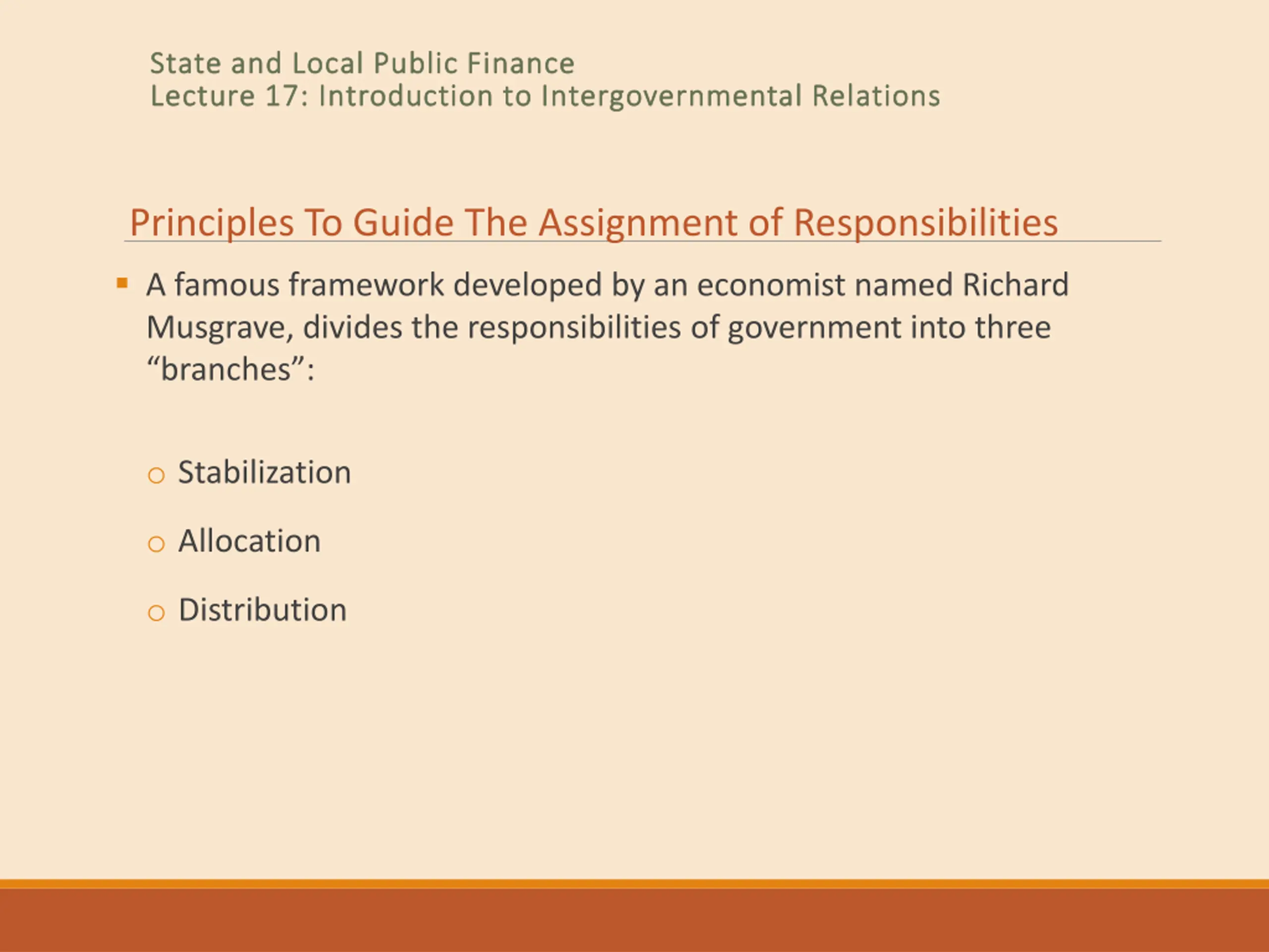 State and Local Public Finance State and Local Public Finance Lecture 17: Introduction to Intergovernmental Relations Lecture 17: Introduction to Intergovernmental Relations Principles To Guide The Assignment of Responsibilities A famous framework developed by an economist named Richard Musgrave, divides the responsibilities of government into three branches : o Stabilization o Allocation o Distribution