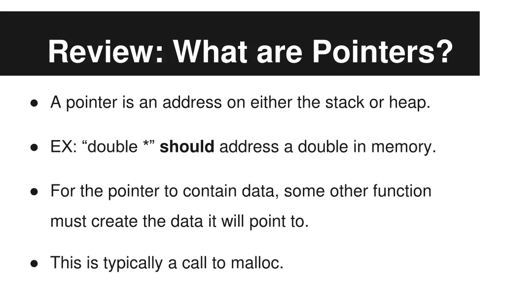 Review: What are Pointers? A pointer is an address on either the stack or heap. EX: double * should address a double in memory. For the pointer to contain data, some other function must create the data it will point to. This is typically a call to malloc.