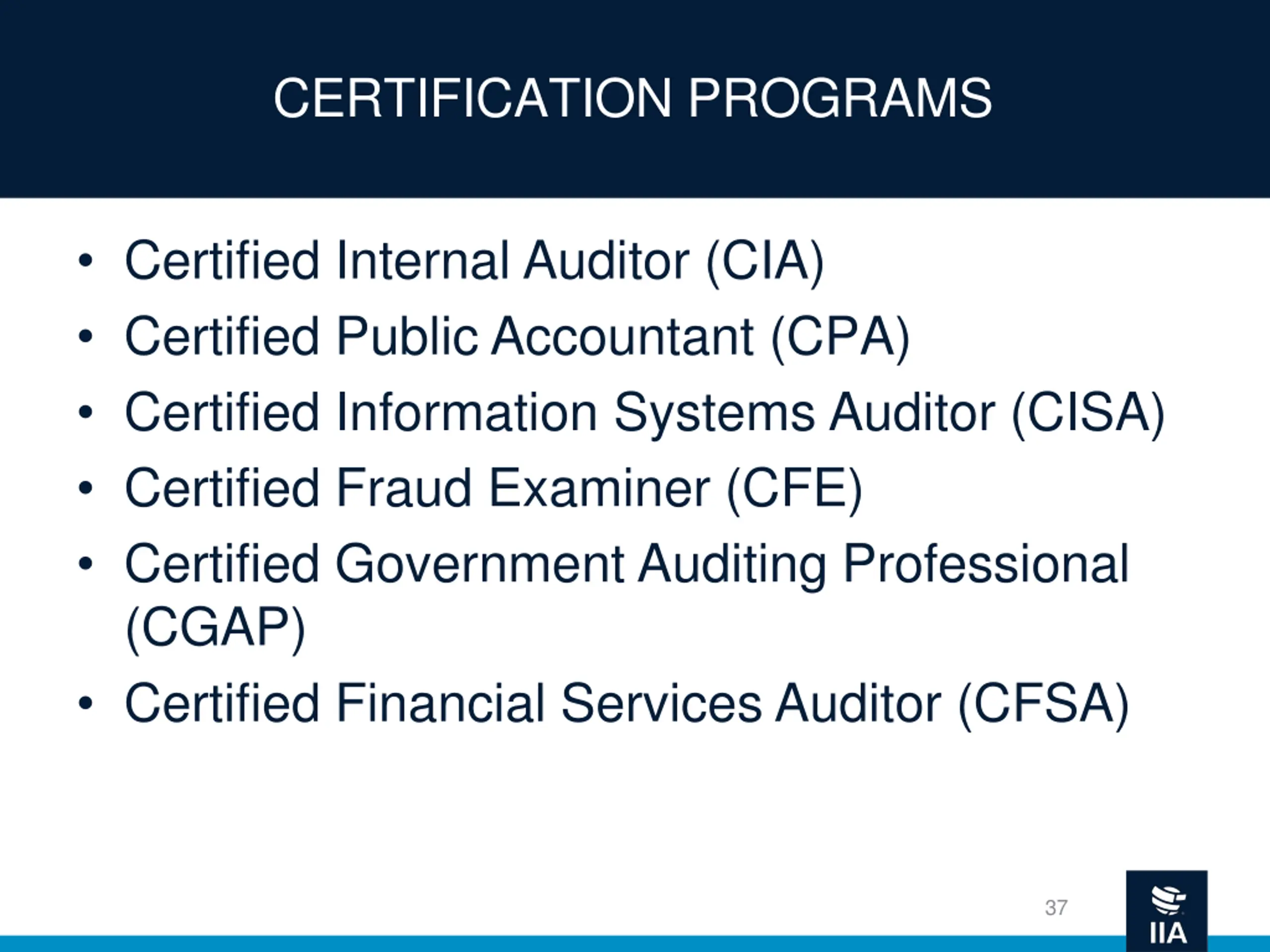 CERTIFICATION PROGRAMS Certified Internal Auditor (CIA) Certified Public Accountant (CPA) Certified Information Systems Auditor (CISA) Certified Fraud Examiner (CFE) Certified Government Auditing Professional (CGAP) Certified Financial Services Auditor (CFSA) 37