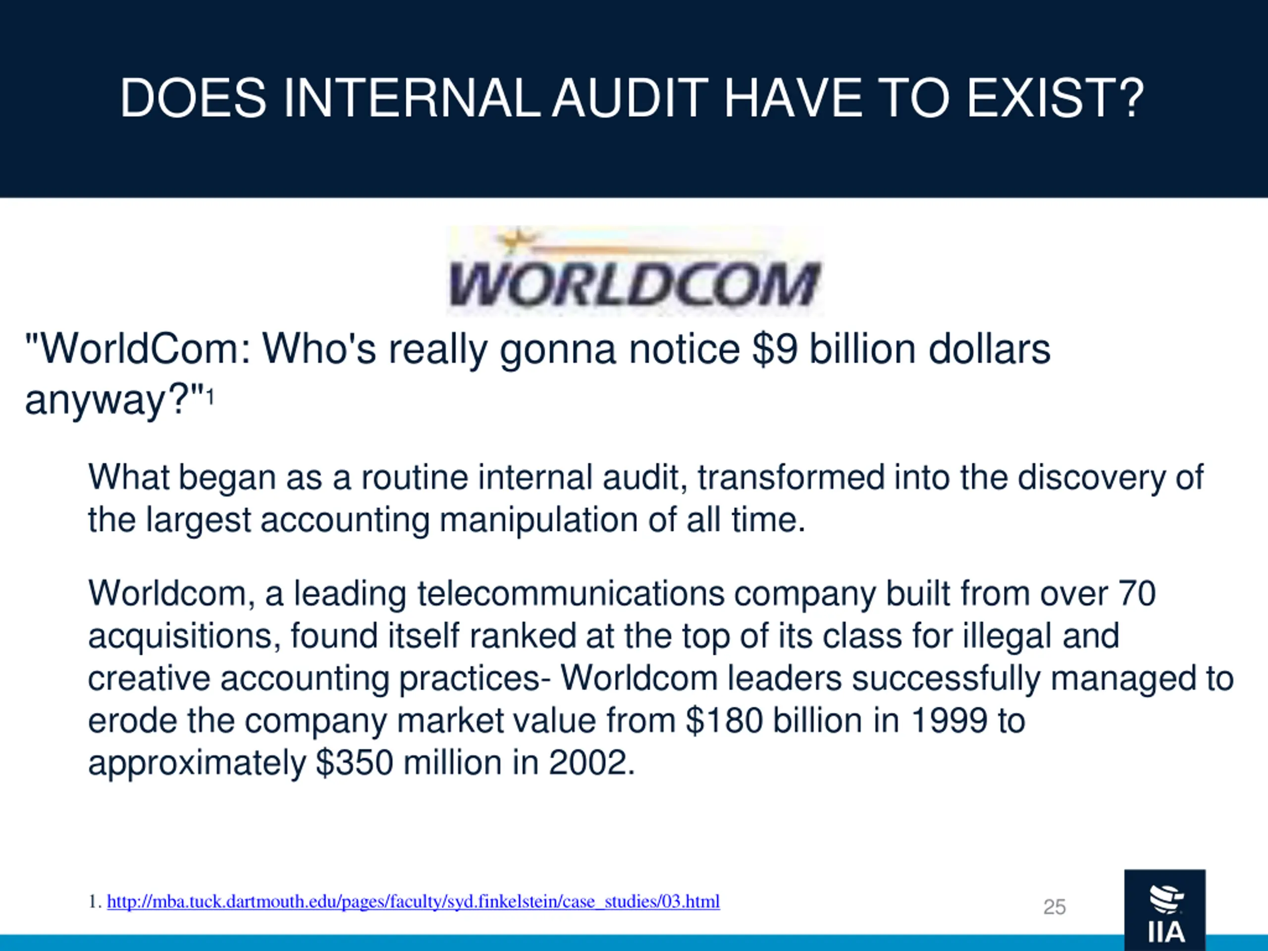 DOES INTERNAL AUDIT HAVE TO EXIST? "WorldCom: Who's really gonna notice $9 billion dollars anyway?"1 What began as a routine internal audit, transformed into the discovery of the largest accounting manipulation of all time. Worldcom, a leading telecommunications company built from over 70 acquisitions, found itself ranked at the top of its class for illegal and creative accounting practices- Worldcom leaders successfully managed to erode the company market value from $180 billion in 1999 to approximately $350 million in 2002. 1. http://mba.tuck.dartmouth.edu/pages/faculty/syd.finkelstein/case_studies/03.html 25