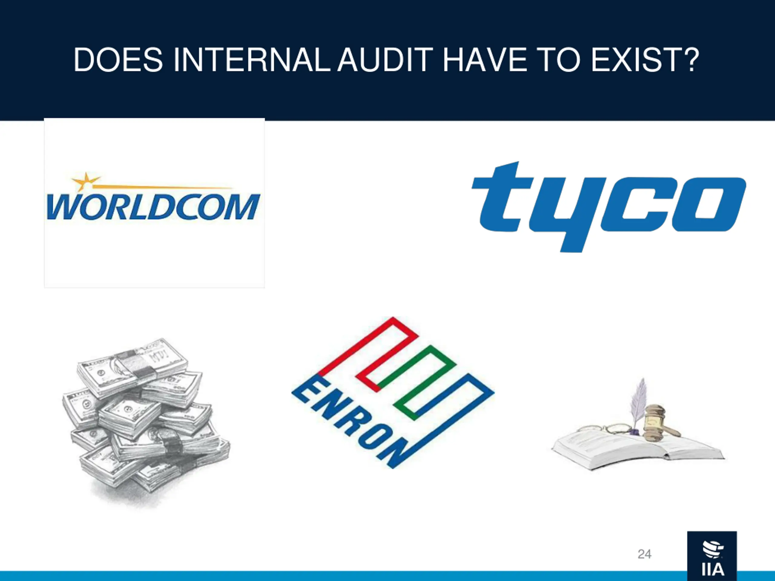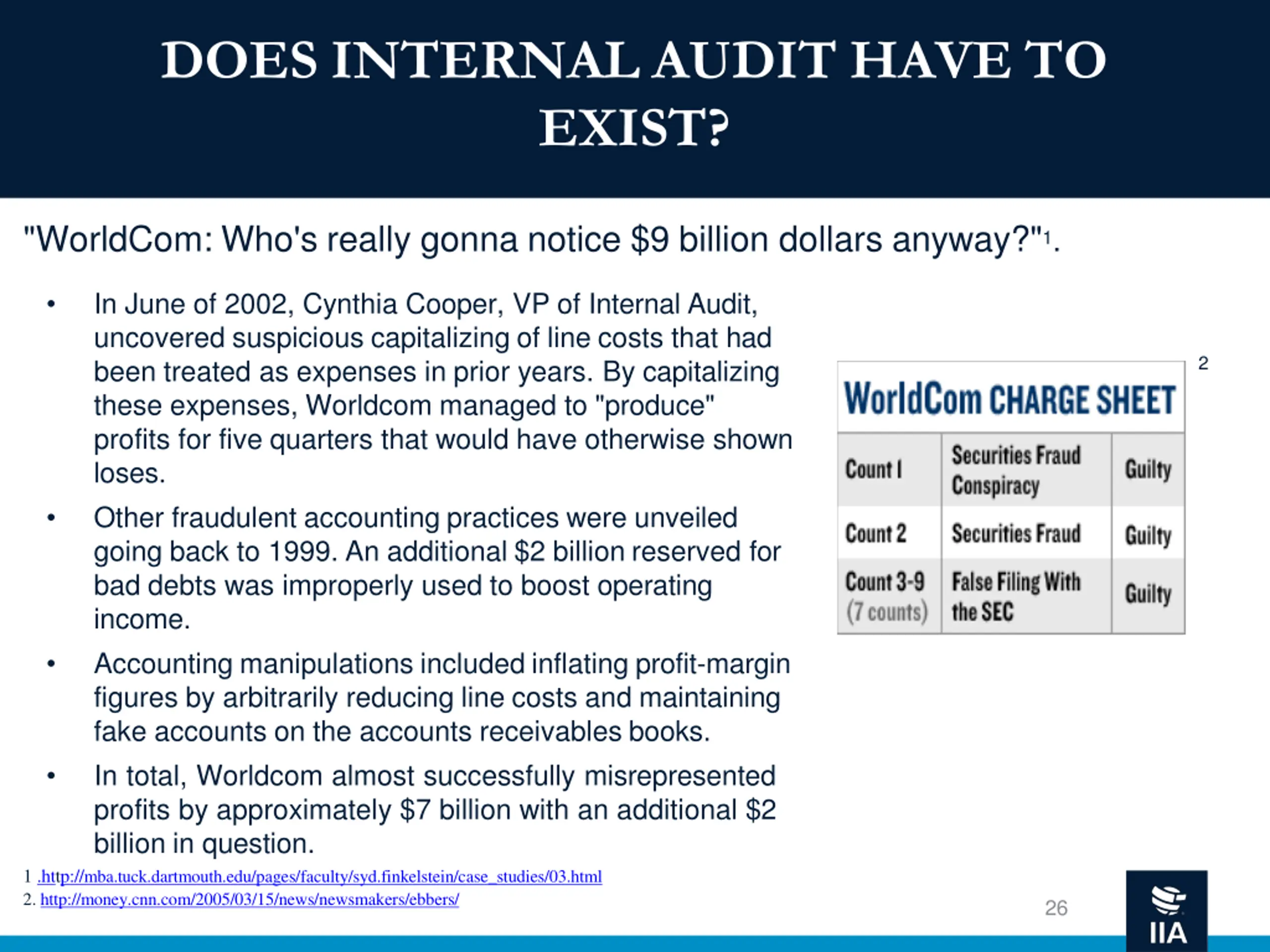 DOES INTERNAL AUDIT HAVE TO EXIST? "WorldCom: Who's really gonna notice $9 billion dollars anyway?"1. In June of 2002, Cynthia Cooper, VP of Internal Audit, uncovered suspicious capitalizing of line costs that had been treated as expenses in prior years. By capitalizing these expenses, Worldcom managed to "produce" profits for five quarters that would have otherwise shown loses. Other fraudulent accounting practices were unveiled going back to 1999. An additional $2 billion reserved for bad debts was improperly used to boost operating income. Accounting manipulations included inflating profit-margin figures by arbitrarily reducing line costs and maintaining fake accounts on the accounts receivables books. In total, Worldcom almost successfully misrepresented profits by approximately $7 billion with an additional $2 billion in question. 2 1 .http://mba.tuck.dartmouth.edu/pages/faculty/syd.finkelstein/case_studies/03.html 2. http://money.cnn.com/2005/03/15/news/newsmakers/ebbers/ 26