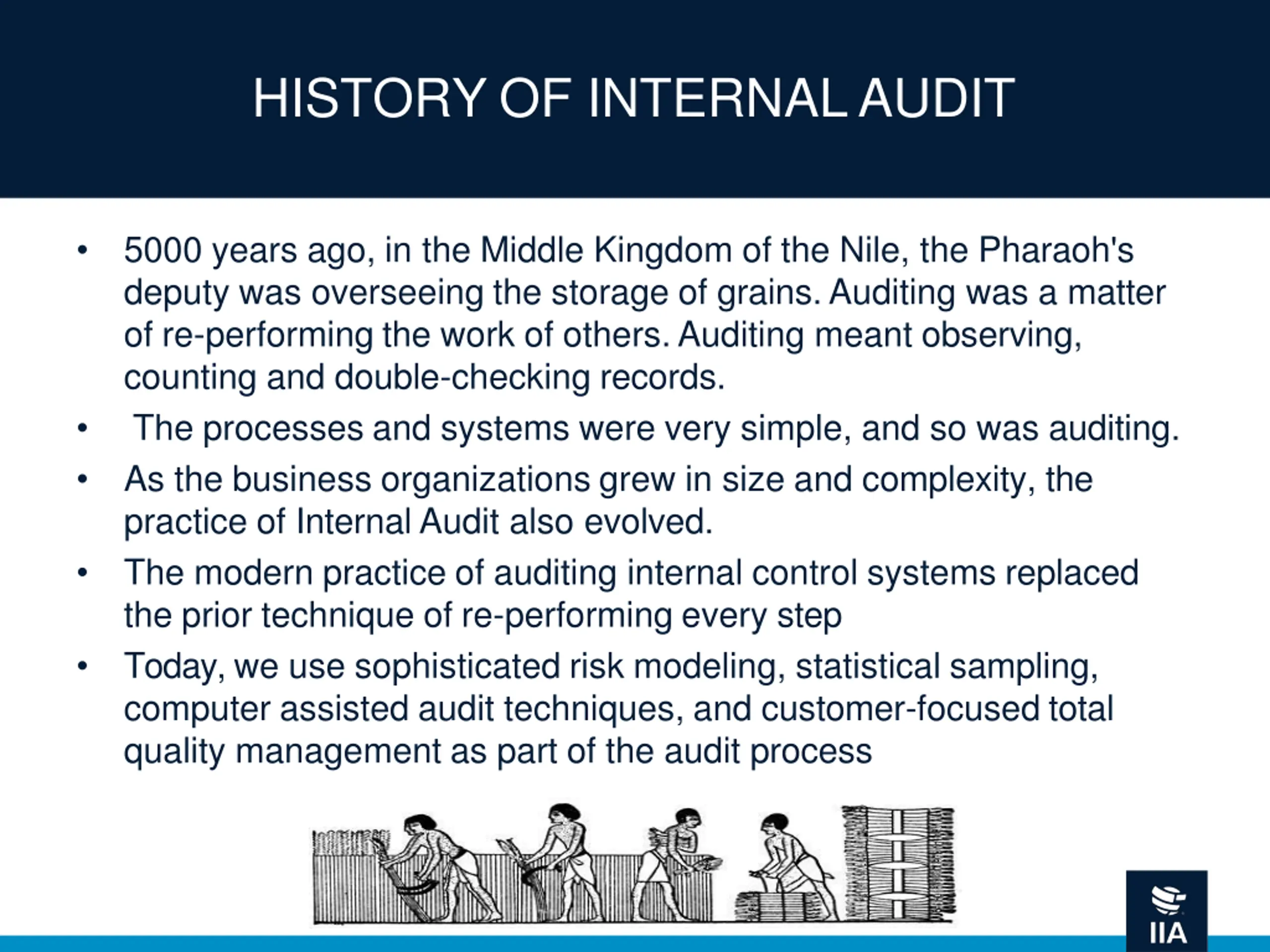 HISTORY OF INTERNAL AUDIT 5000 years ago, in the Middle Kingdom of the Nile, the Pharaoh's deputy was overseeing the storage of grains. Auditing was a matter of re-performing the work of others. Auditing meant observing, counting and double-checking records. The processes and systems were very simple, and so was auditing. As the business organizations grew in size and complexity, the practice of Internal Audit also evolved. The modern practice of auditing internal control systems replaced the prior technique of re-performing every step Today, we use sophisticated risk modeling, statistical sampling, computer assisted audit techniques, and customer-focused total quality management as part of the audit process