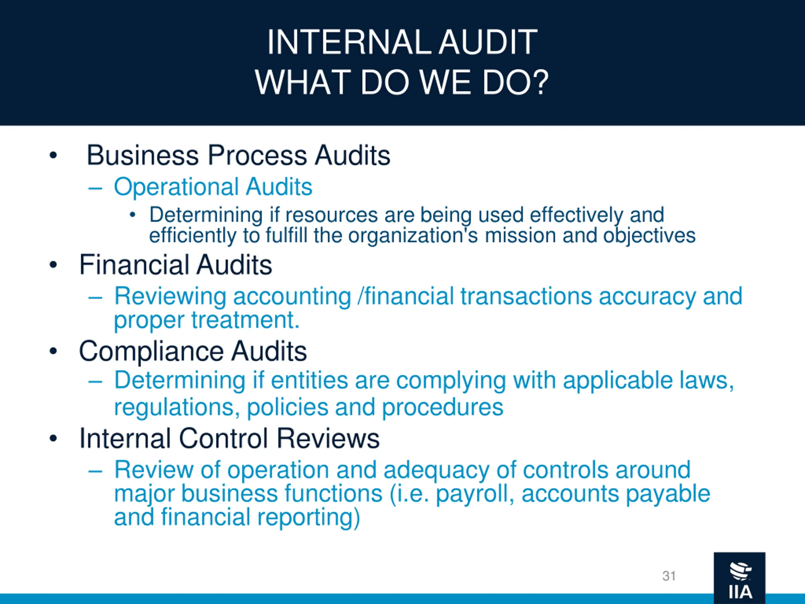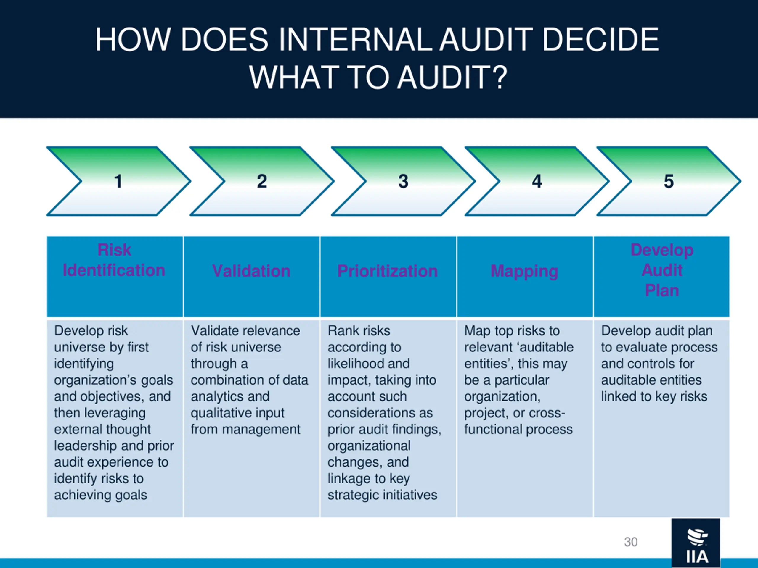 HOW DOES INTERNAL AUDIT DECIDE WHAT TO AUDIT? 1 2 3 4 5 Risk Develop Audit Plan Identification Validation Prioritization Mapping Develop risk universe by first identifying organization s goals and objectives, and then leveraging external thought leadership and prior audit experience to identify risks to achieving goals Validate relevance of risk universe through a combination of data analytics and qualitative input from management Rank risks according to likelihood and impact, taking into account such considerations as prior audit findings, organizational changes, and linkage to key strategic initiatives Map top risks to relevant auditable entities , this may be a particular organization, project, or cross- functional process Develop audit plan to evaluate process and controls for auditable entities linked to key risks 30