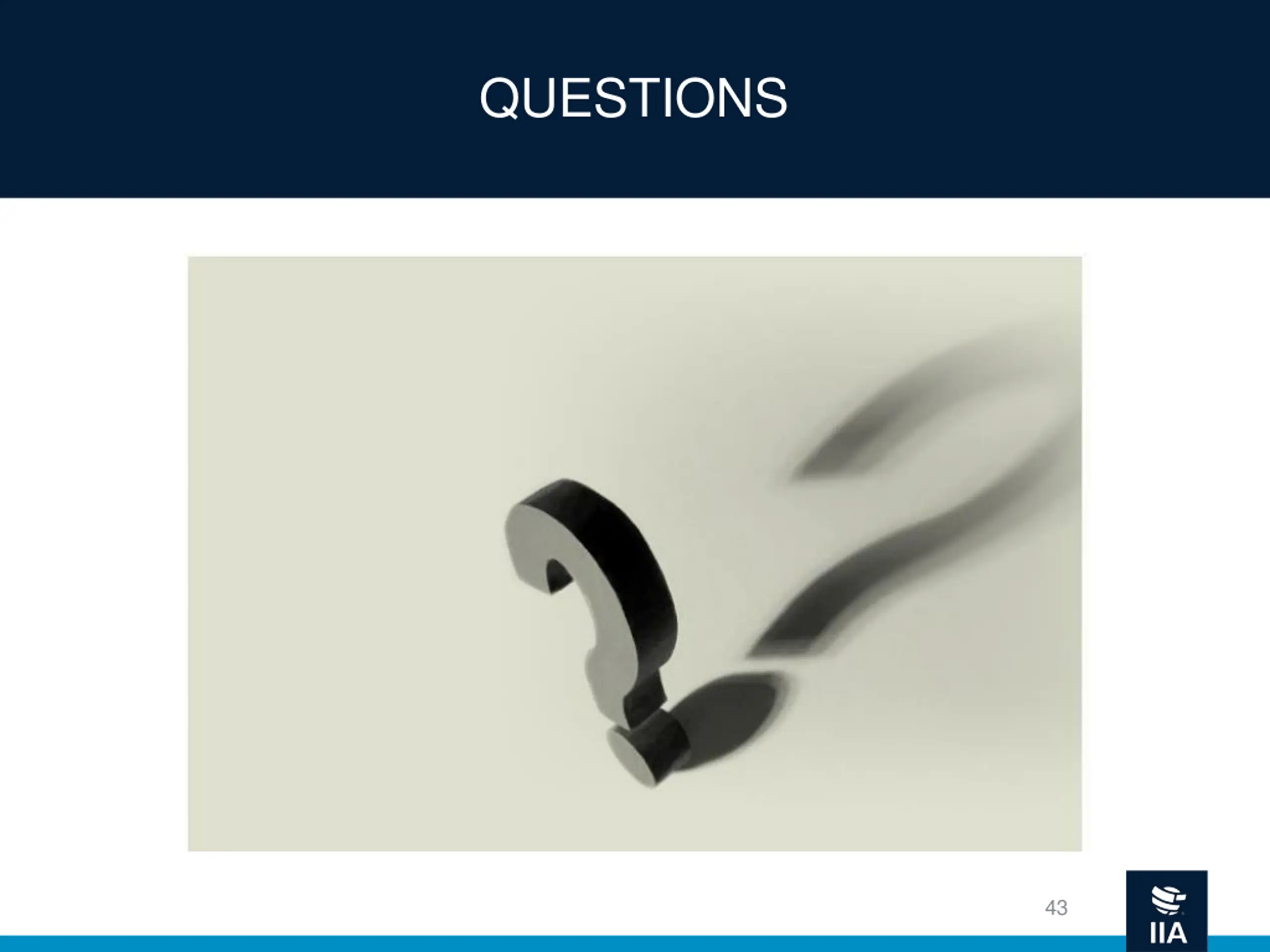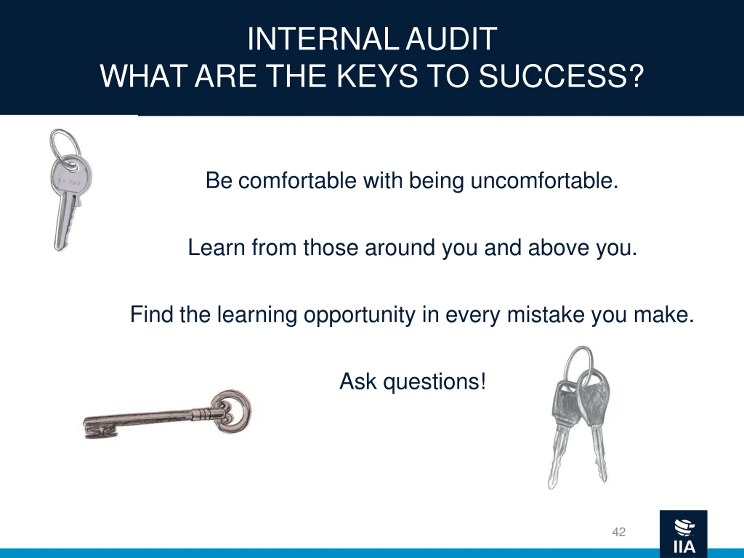 INTERNAL AUDIT WHAT ARE THE KEYS TO SUCCESS? Be comfortable with being uncomfortable. Learn from those around you and above you. Find the learning opportunity in every mistake you make. Ask questions! 42