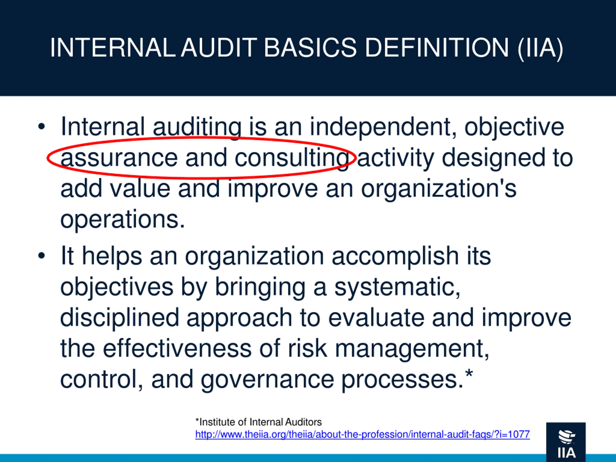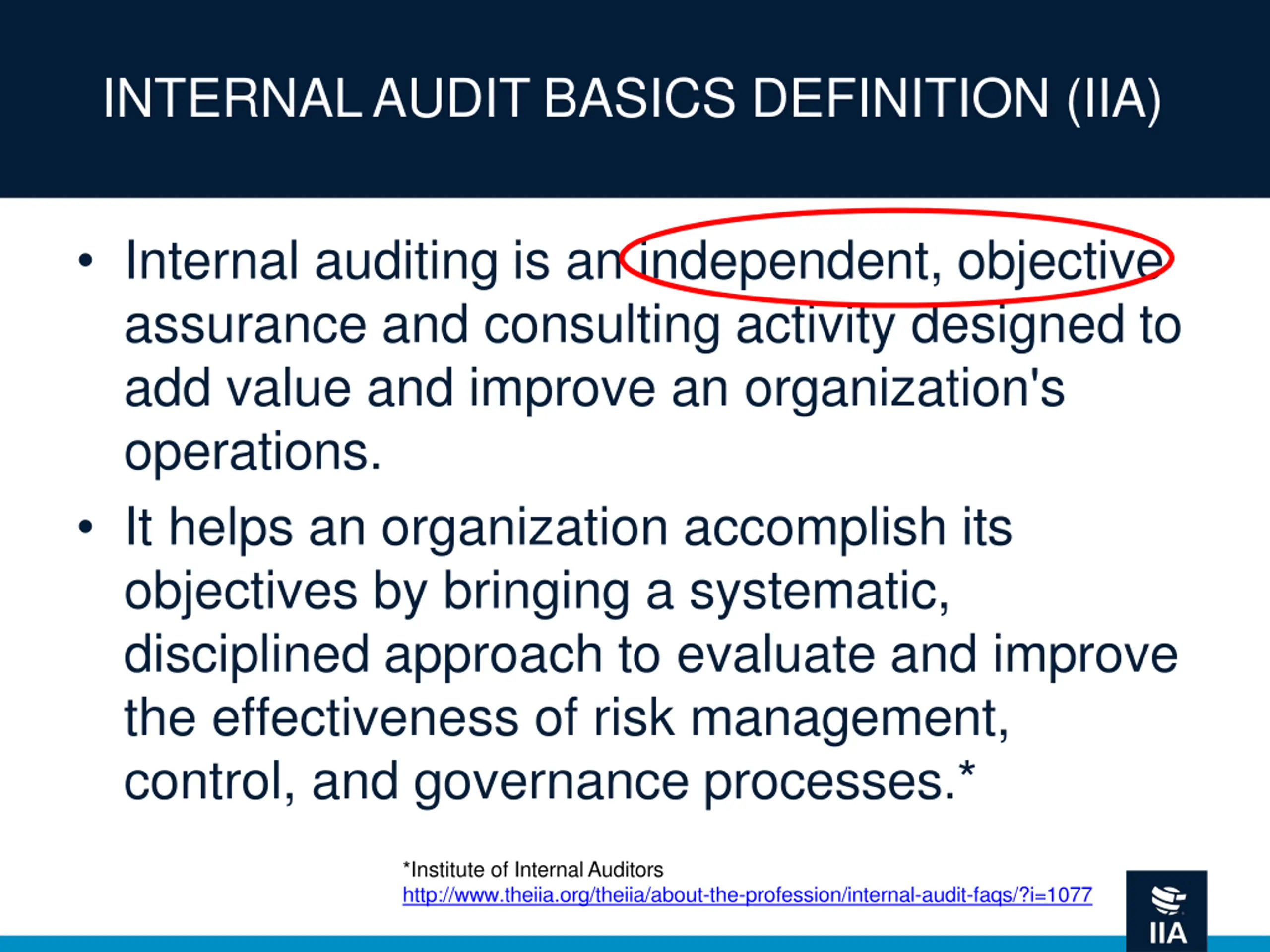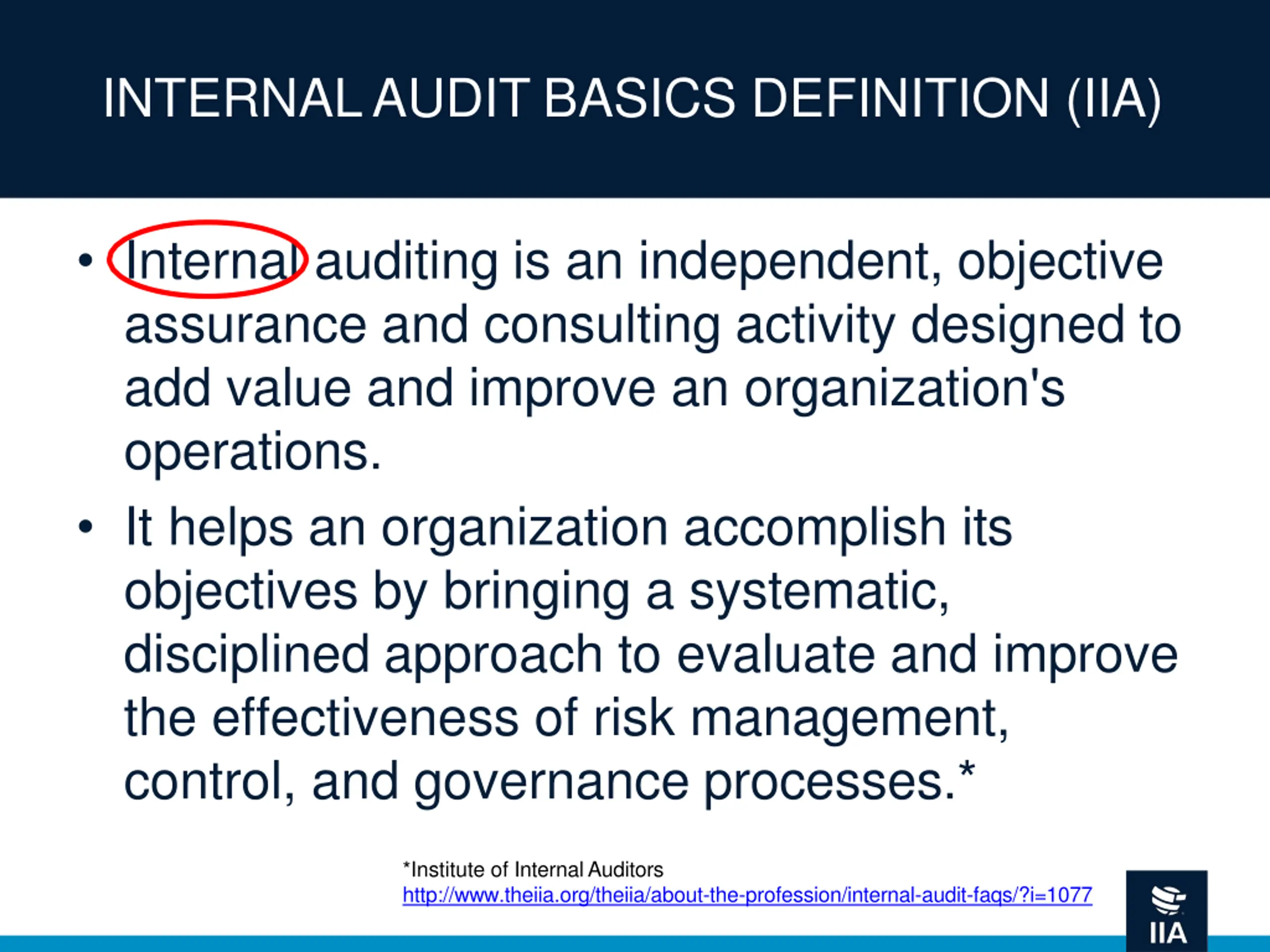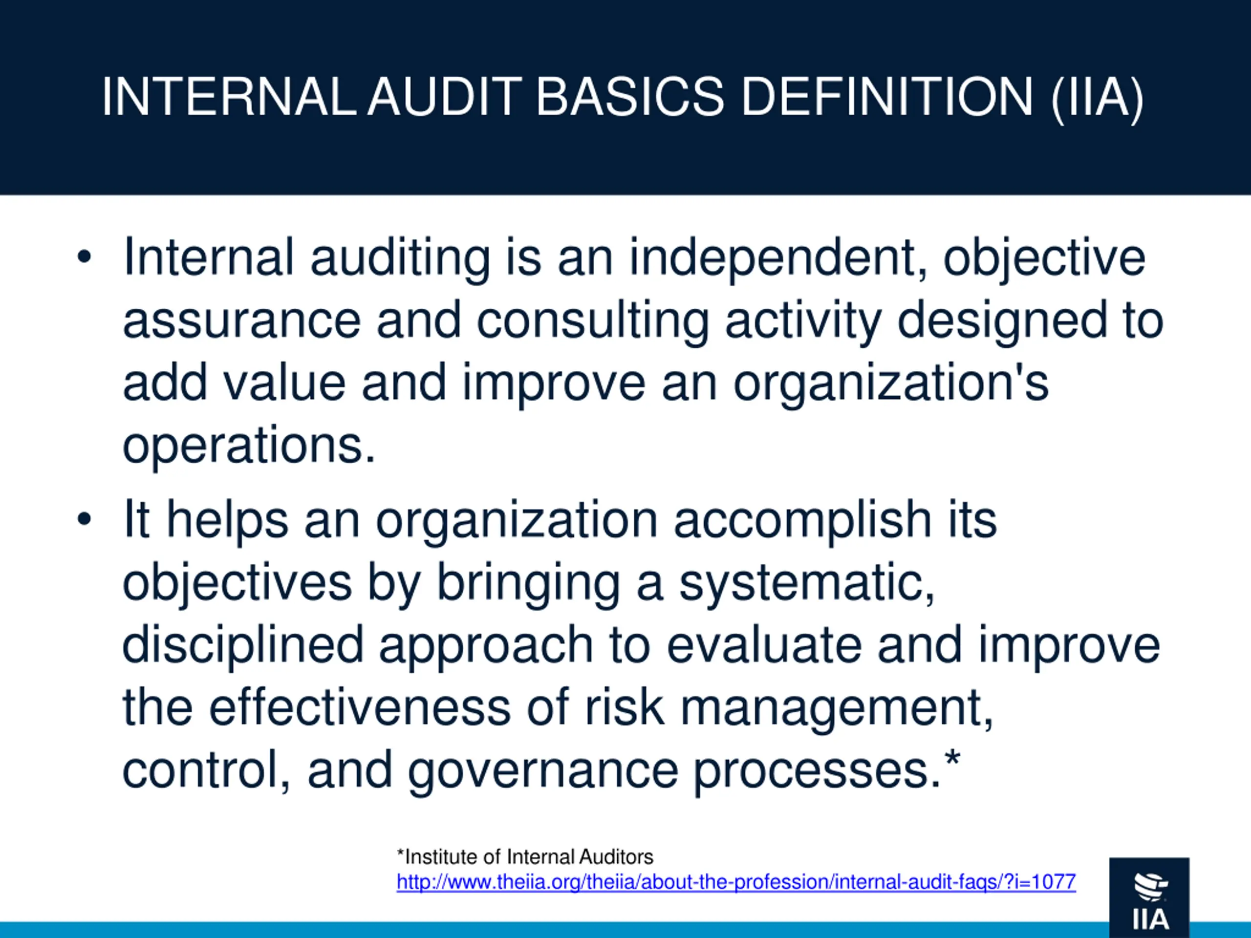 INTERNAL AUDIT BASICS DEFINITION (IIA) Internal auditing is an independent, objective assurance and consulting activity designed to add value and improve an organization's operations. It helps an organization accomplish its objectives by bringing a systematic, disciplined approach to evaluate and improve the effectiveness of risk management, control, and governance processes.* *Institute of Internal Auditors http://www.theiia.org/theiia/about-the-profession/internal-audit-faqs/?i=1077