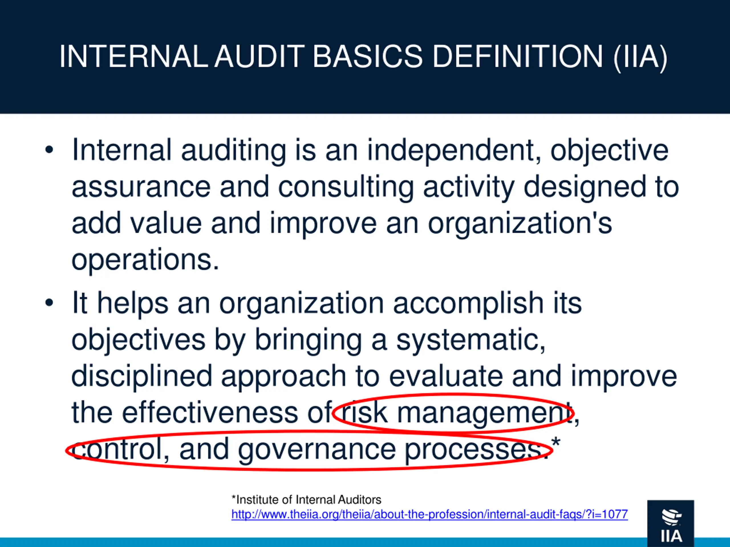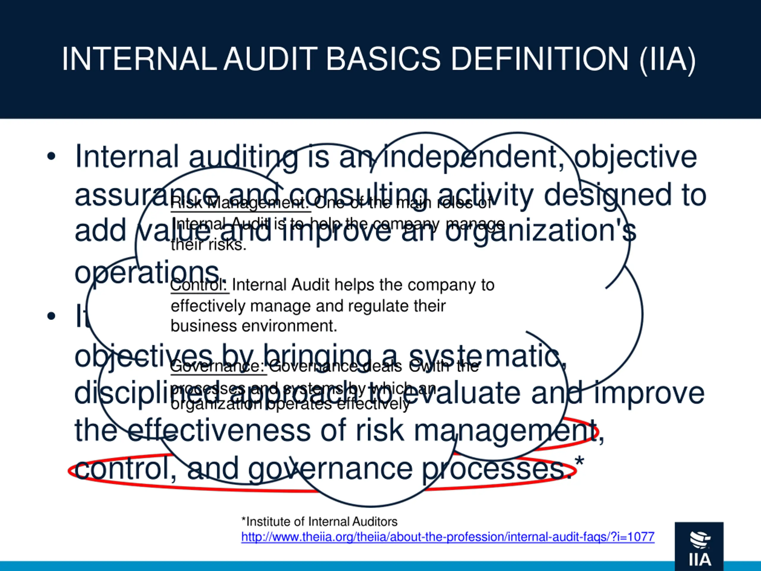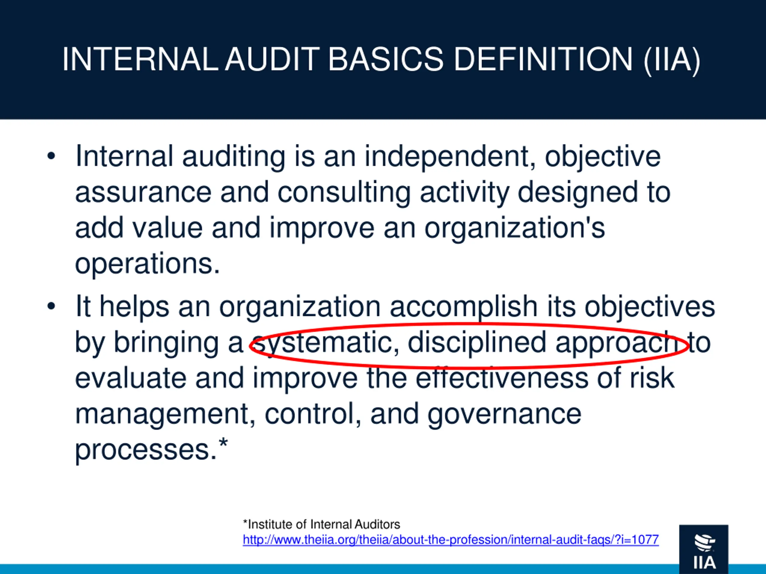 INTERNAL AUDIT BASICS DEFINITION (IIA) Internal auditing is an independent, objective assurance and consulting activity designed to add value and improve an organization's operations. It helps an organization accomplish its objectives by bringing a systematic, disciplined approach to evaluate and improve the effectiveness of risk management, control, and governance processes.* *Institute of Internal Auditors http://www.theiia.org/theiia/about-the-profession/internal-audit-faqs/?i=1077