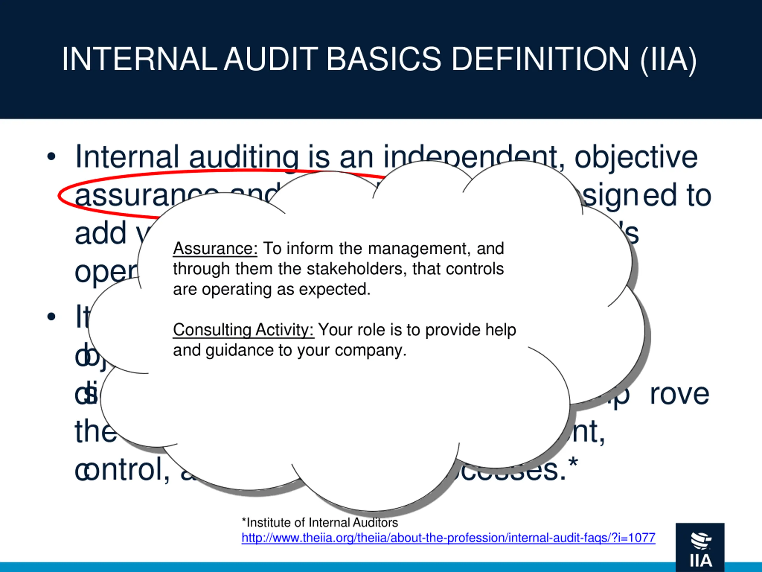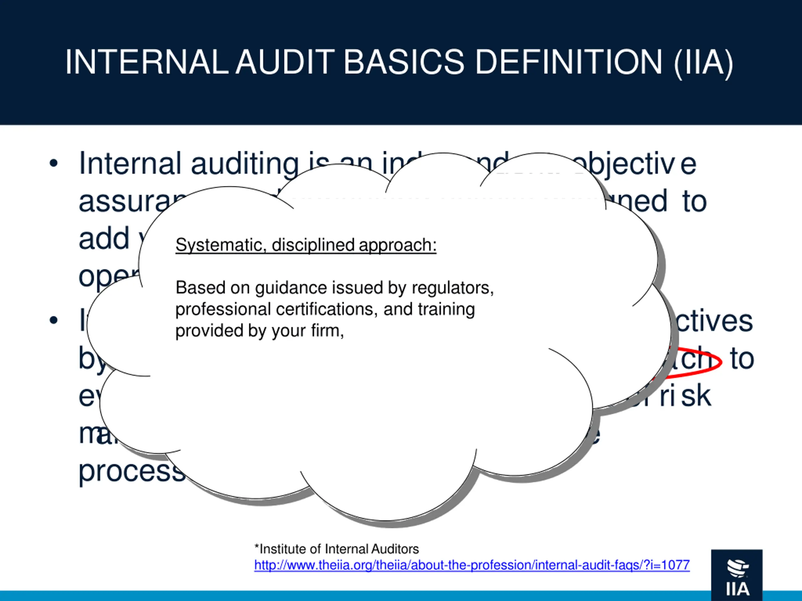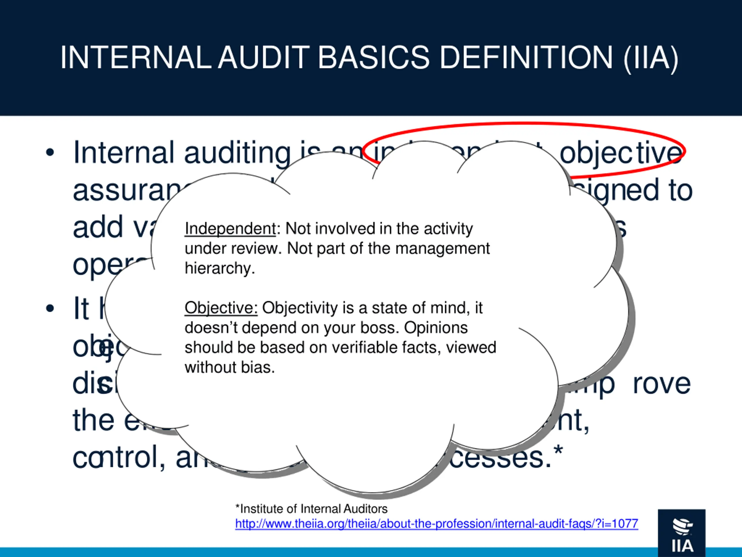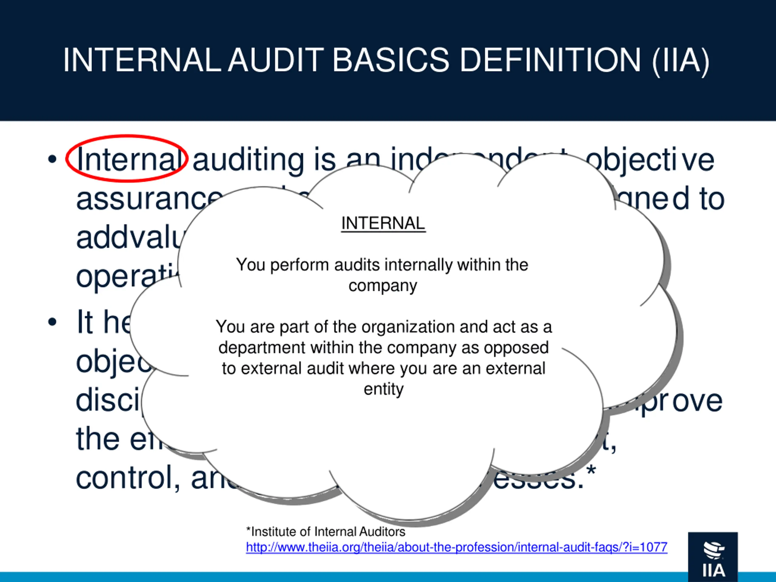 INTERNAL AUDIT BASICS DEFINITION (IIA) Internal auditing is an independent, objective assurance and consulting activity designed to add value and improve an organization's operations. It helps an organization accomplish its objectives by bringing a systematic, disciplined approach to evaluate and improve the effectiveness of risk management, control, and governance processes.* *Institute of Internal Auditors http://www.theiia.org/theiia/about-the-profession/internal-audit-faqs/?i=1077