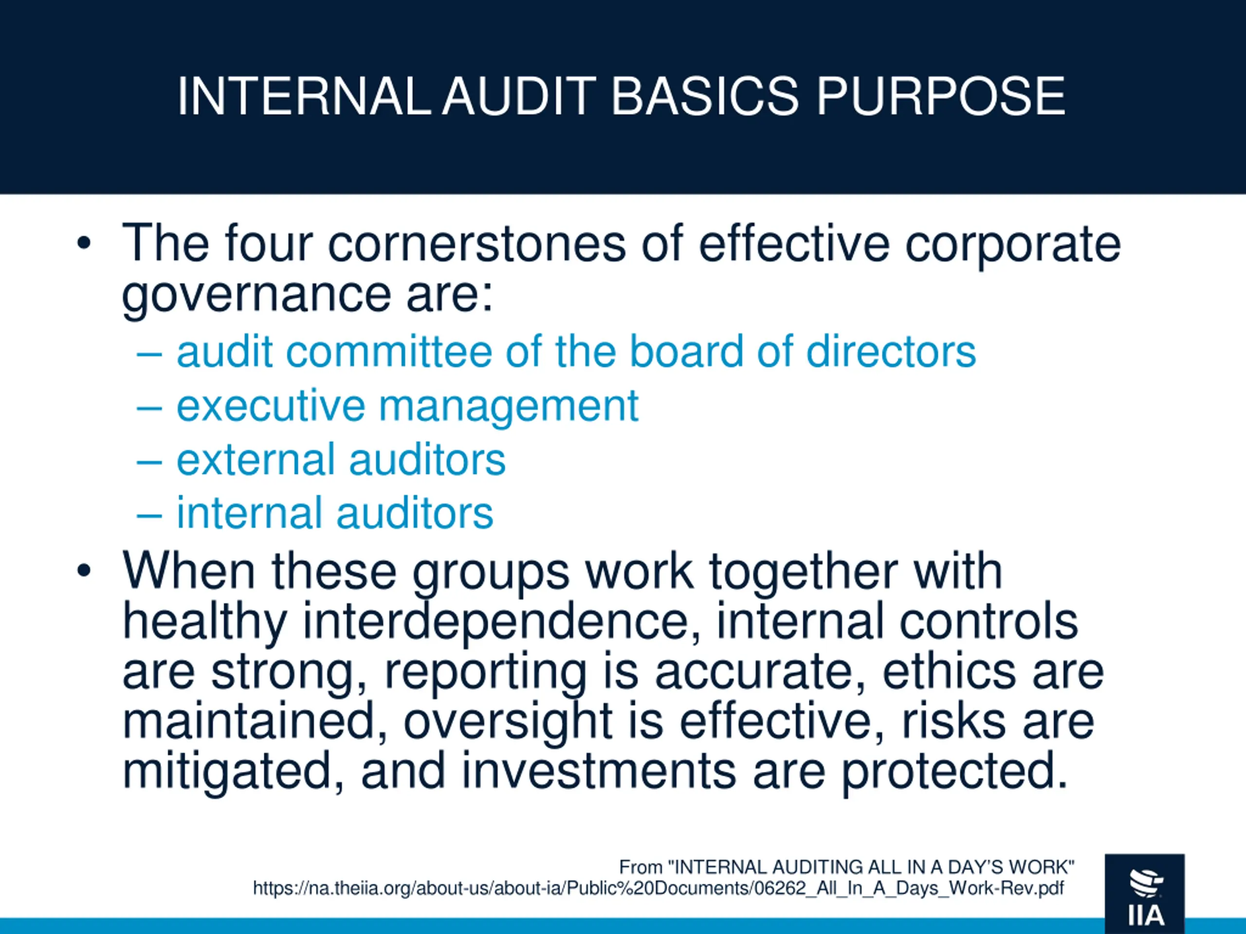 INTERNAL AUDIT BASICS PURPOSE The four cornerstones of effective corporate governance are: audit committee of the board of directors executive management external auditors internal auditors When these groups work together with healthy interdependence, internal controls are strong, reporting is accurate, ethics are maintained, oversight is effective, risks are mitigated, and investments are protected. From "INTERNAL AUDITING ALL IN A DAY S WORK" https://na.theiia.org/about-us/about-ia/Public%20Documents/06262_All_In_A_Days_Work-Rev.pdf