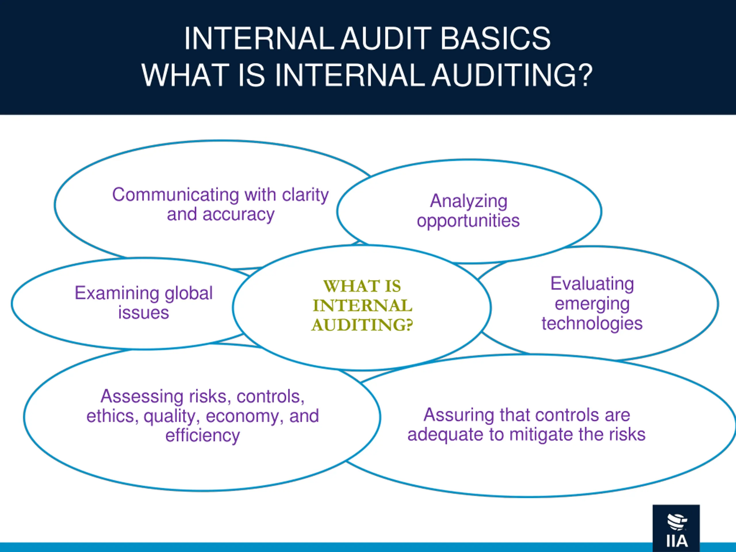 INTERNAL AUDIT BASICS WHAT IS INTERNAL AUDITING? Communicating with clarity and accuracy Analyzing opportunities Evaluating emerging technologies WHAT IS INTERNAL AUDITING? Examining global issues Assessing risks, controls, ethics, quality, economy, and efficiency Assuring that controls are adequate to mitigate the risks