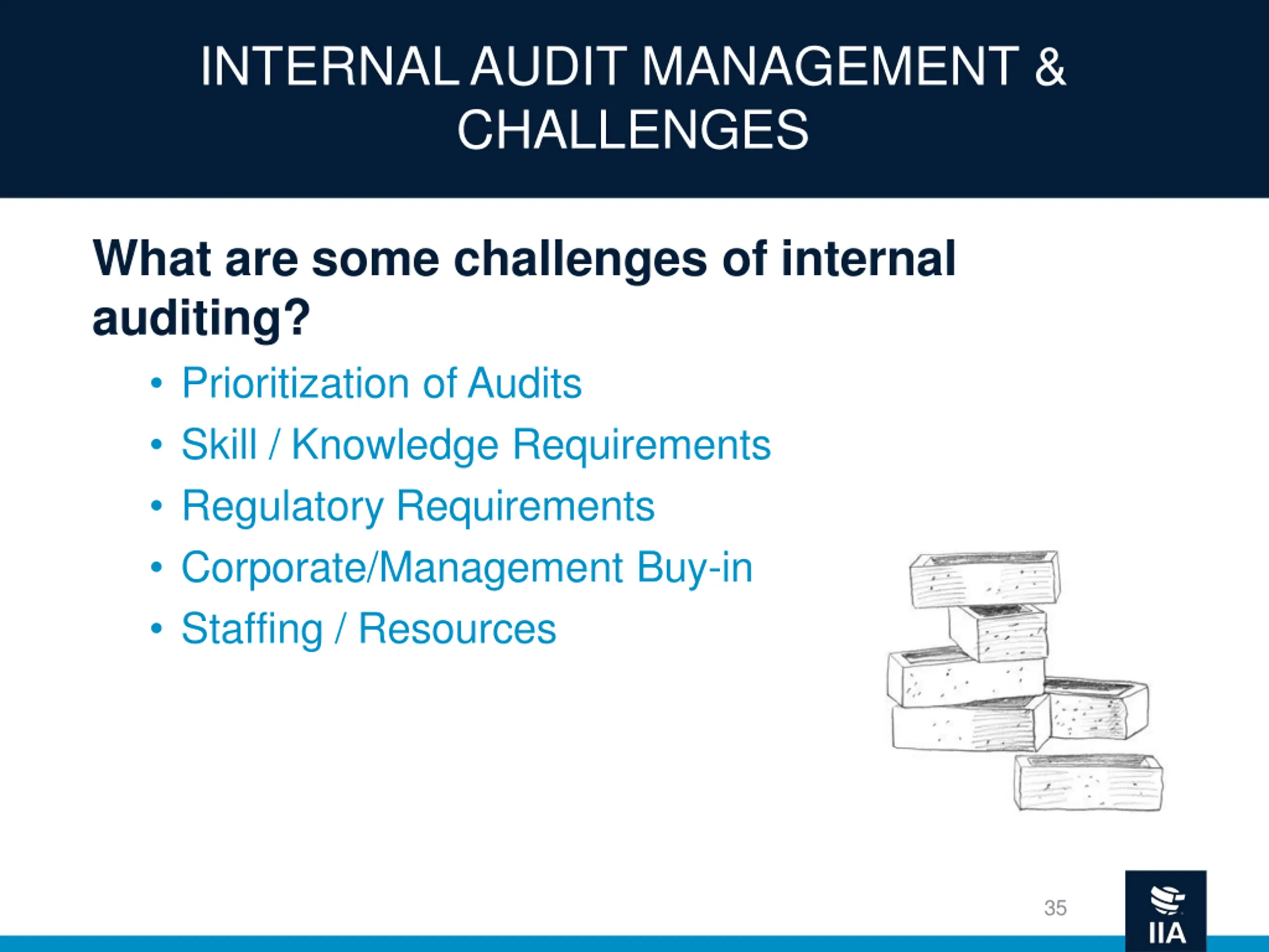 INTERNAL AUDIT MANAGEMENT & CHALLENGES What are some challenges of internal auditing? Prioritization of Audits Skill / Knowledge Requirements Regulatory Requirements Corporate/Management Buy-in Staffing / Resources 35