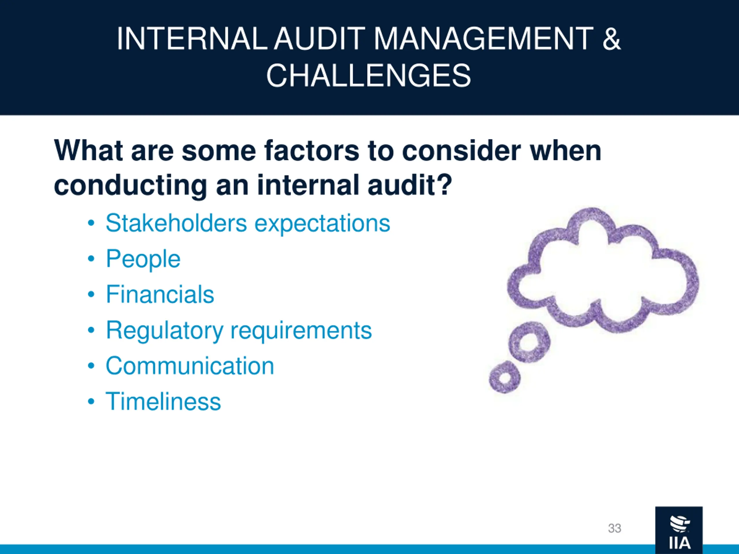 INTERNAL AUDIT MANAGEMENT & CHALLENGES What are some factors to consider when conducting an internal audit? Stakeholders expectations People Financials Regulatory requirements Communication Timeliness 33