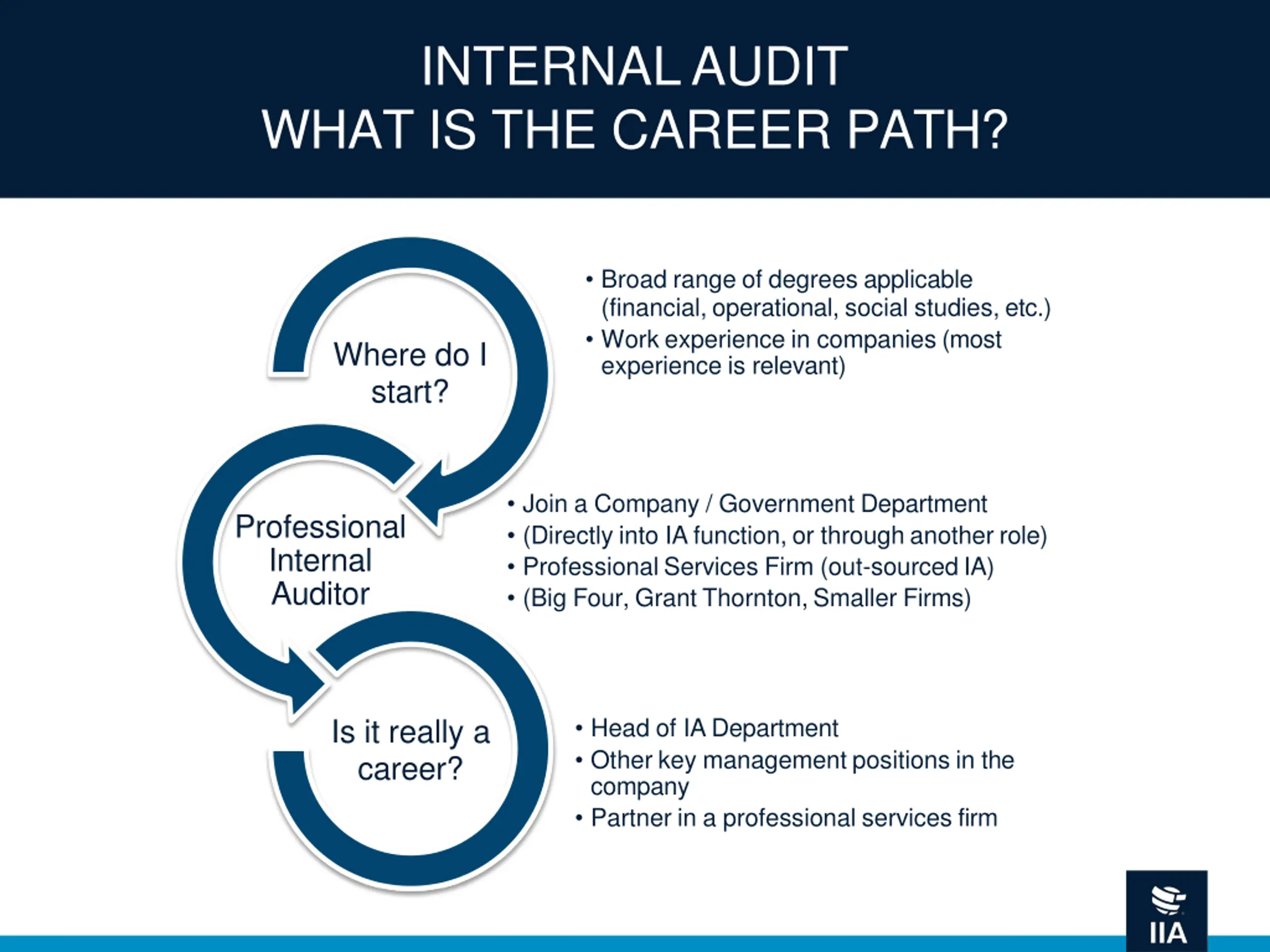 INTERNAL AUDIT WHAT IS THE CAREER PATH? Broad range of degrees applicable (financial, operational, social studies, etc.) Work experience in companies (most experience is relevant) Where do I start? Join a Company / Government Department (Directly into IA function, or through another role) Professional Services Firm (out-sourced IA) (Big Four, Grant Thornton, Smaller Firms) Professional Internal Auditor Is it really a career? Head of IA Department Other key management positions in the company Partner in a professional services firm