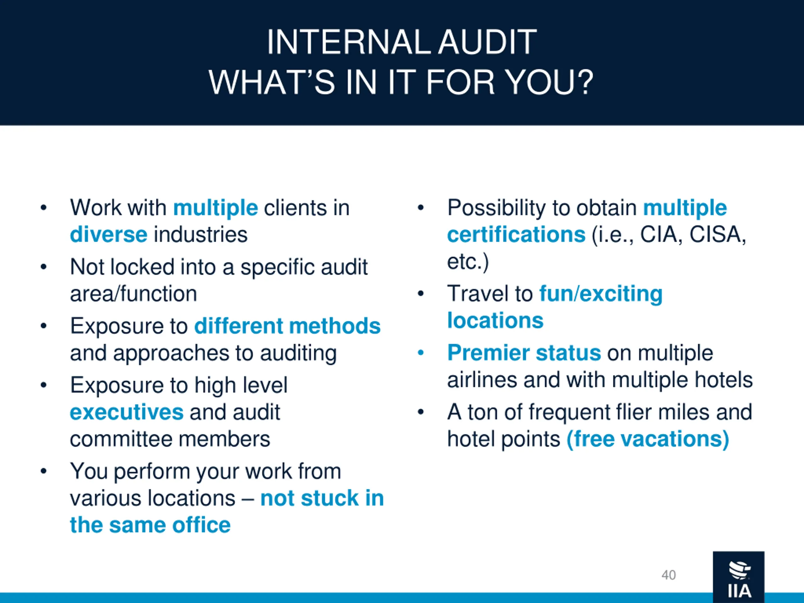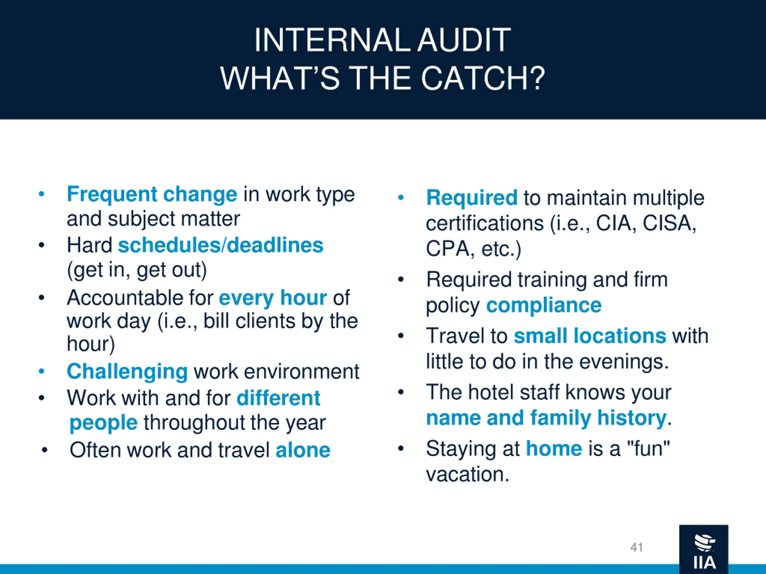 INTERNAL AUDIT WHAT S IN IT FOR YOU? Work with multiple clients in diverse industries Not locked into a specific audit area/function Exposure to different methods and approaches to auditing Exposure to high level executives and audit committee members You perform your work from various locations not stuck in the same office Possibility to obtain multiple certifications (i.e., CIA, CISA, etc.) Travel to fun/exciting locations Premier status on multiple airlines and with multiple hotels A ton of frequent flier miles and hotel points (free vacations) 40