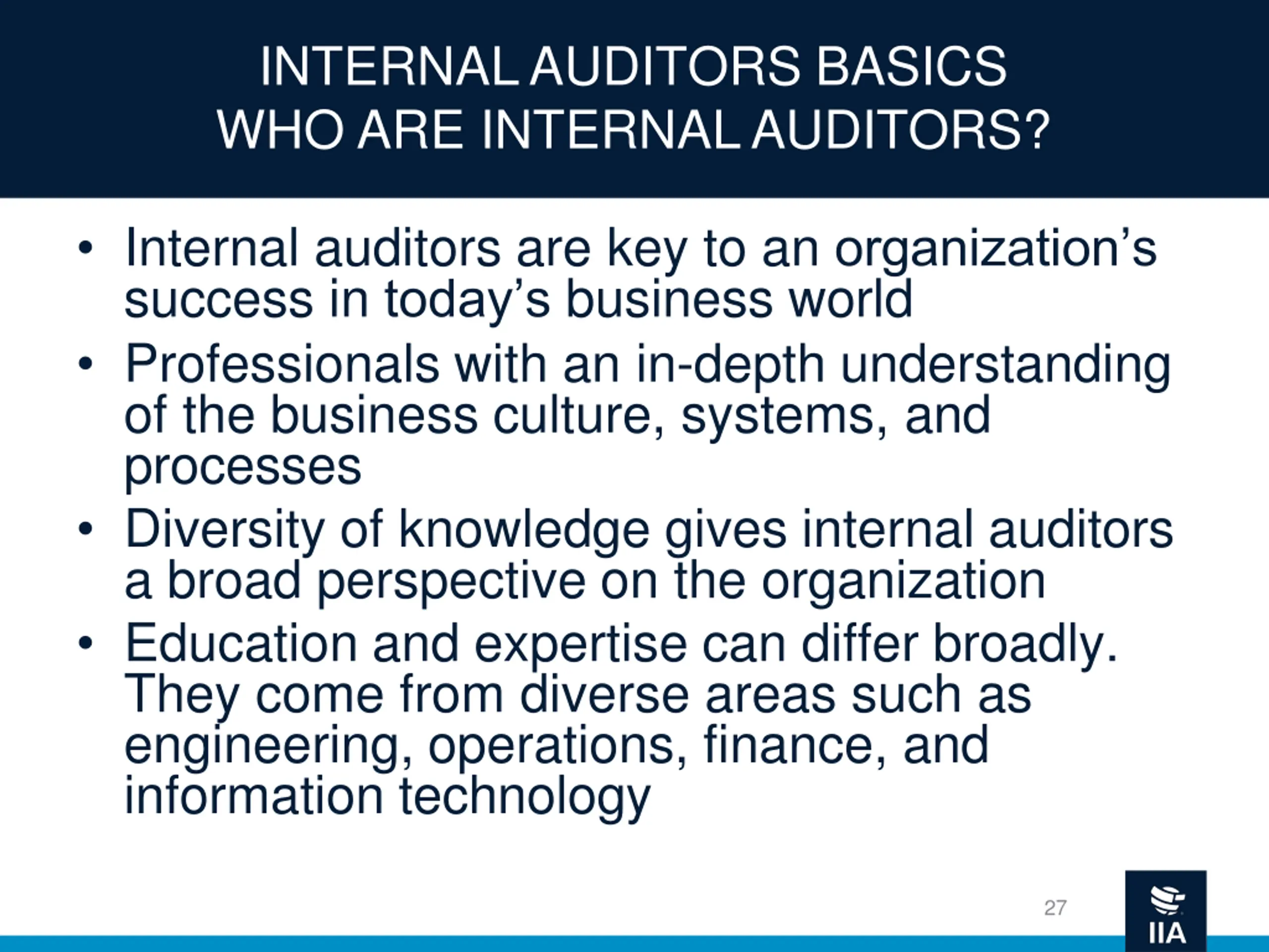 INTERNAL AUDITORS BASICS WHO ARE INTERNAL AUDITORS? Internal auditors are key to an organization s success in today s business world Professionals with an in-depth understanding of the business culture, systems, and processes Diversity of knowledge gives internal auditors a broad perspective on the organization Education and expertise can differ broadly. They come from diverse areas such as engineering, operations, finance, and information technology 27
