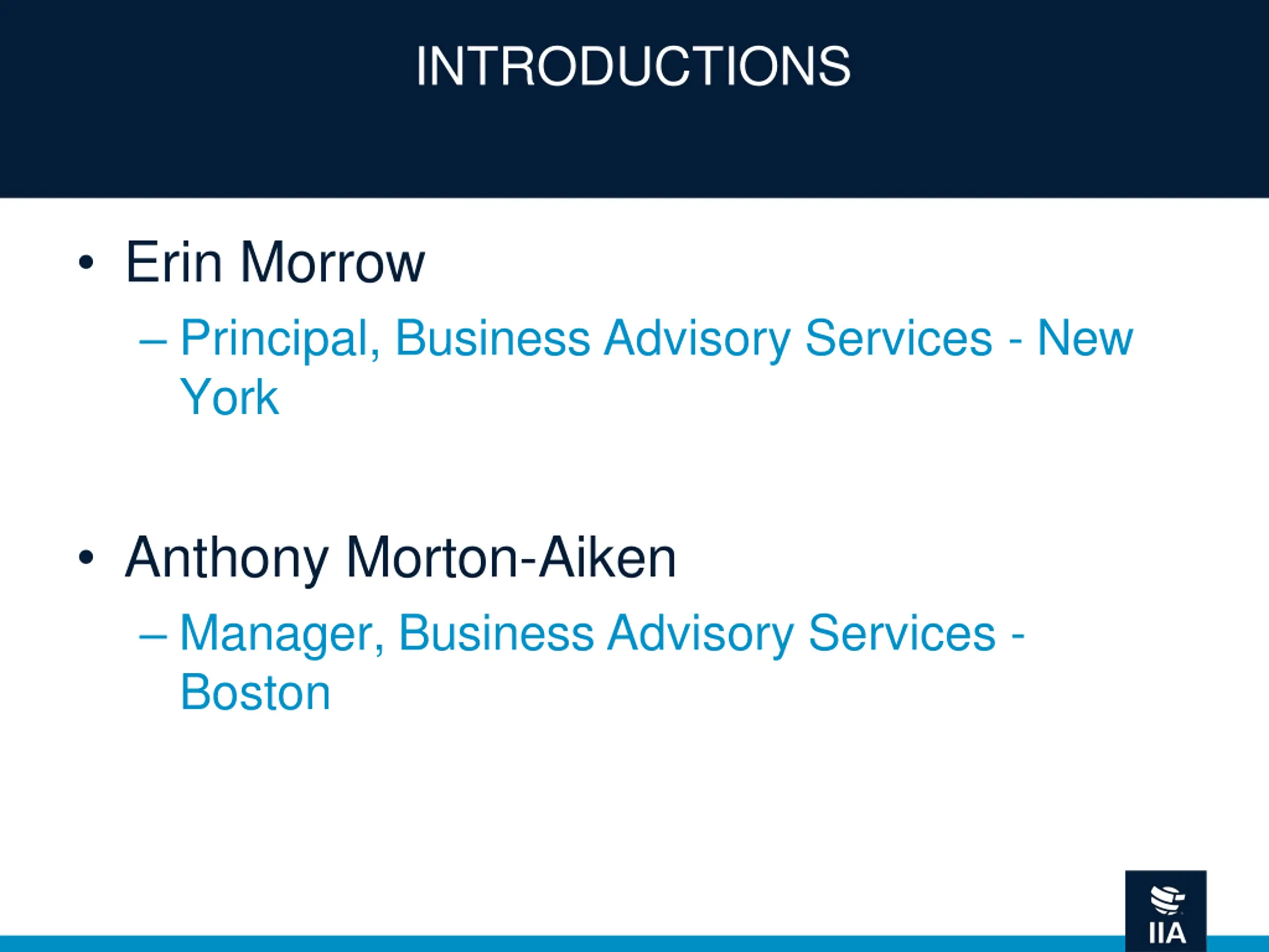 INTRODUCTIONS Erin Morrow Principal, Business Advisory Services - New York Anthony Morton-Aiken Manager, Business Advisory Services - Boston