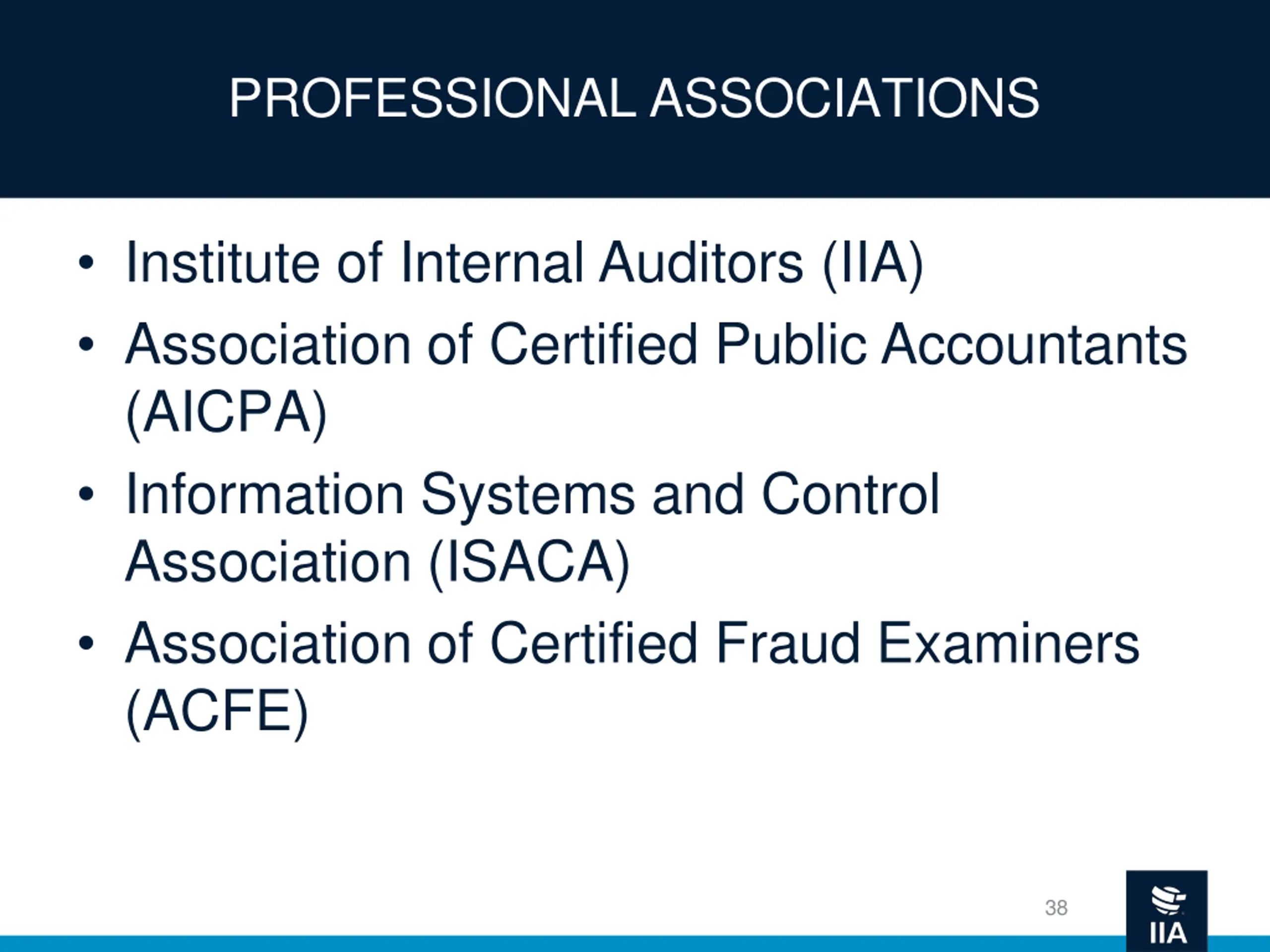 PROFESSIONAL ASSOCIATIONS Institute of Internal Auditors (IIA) Association of Certified Public Accountants (AICPA) Information Systems and Control Association (ISACA) Association of Certified Fraud Examiners (ACFE) 38
