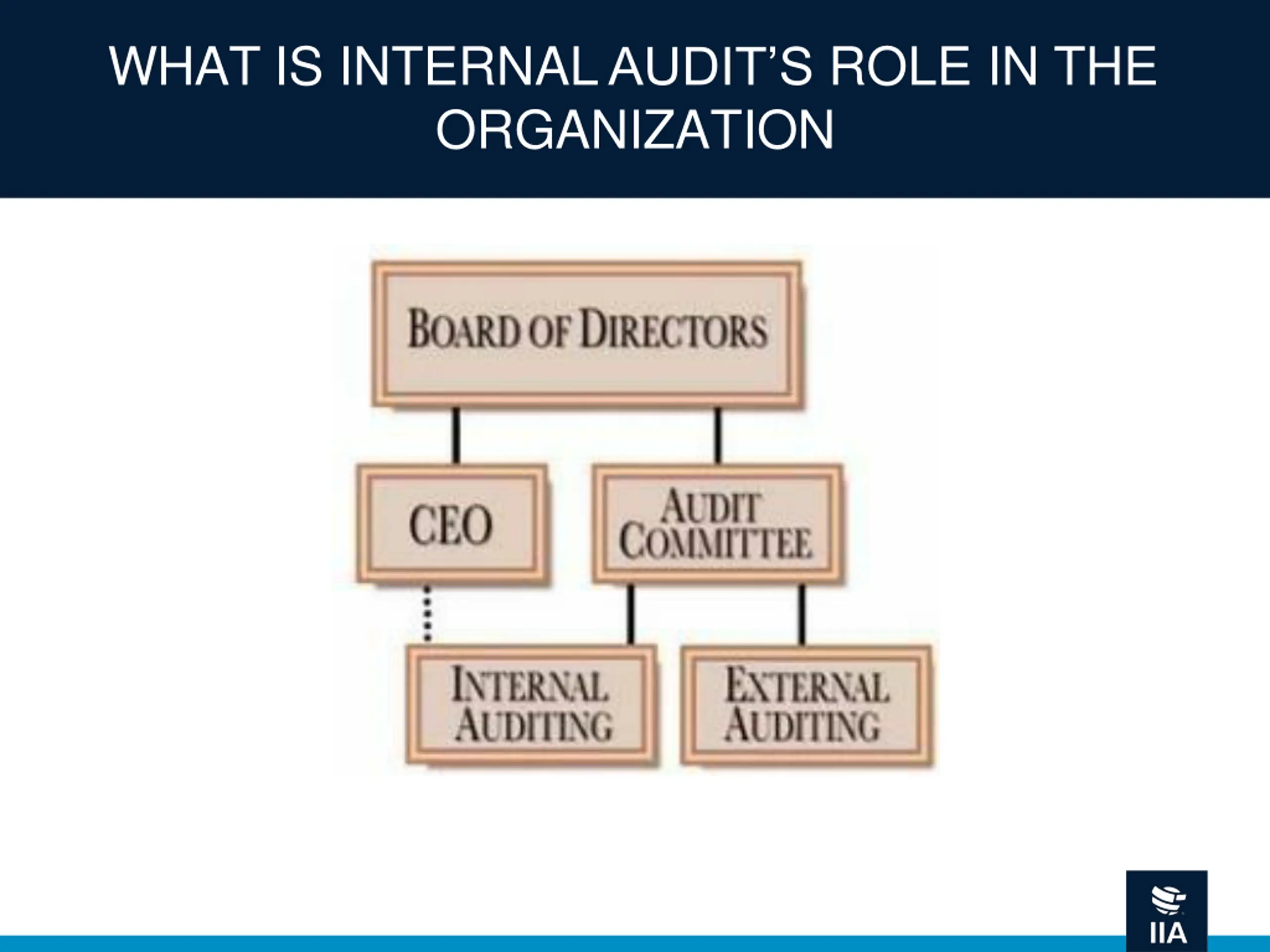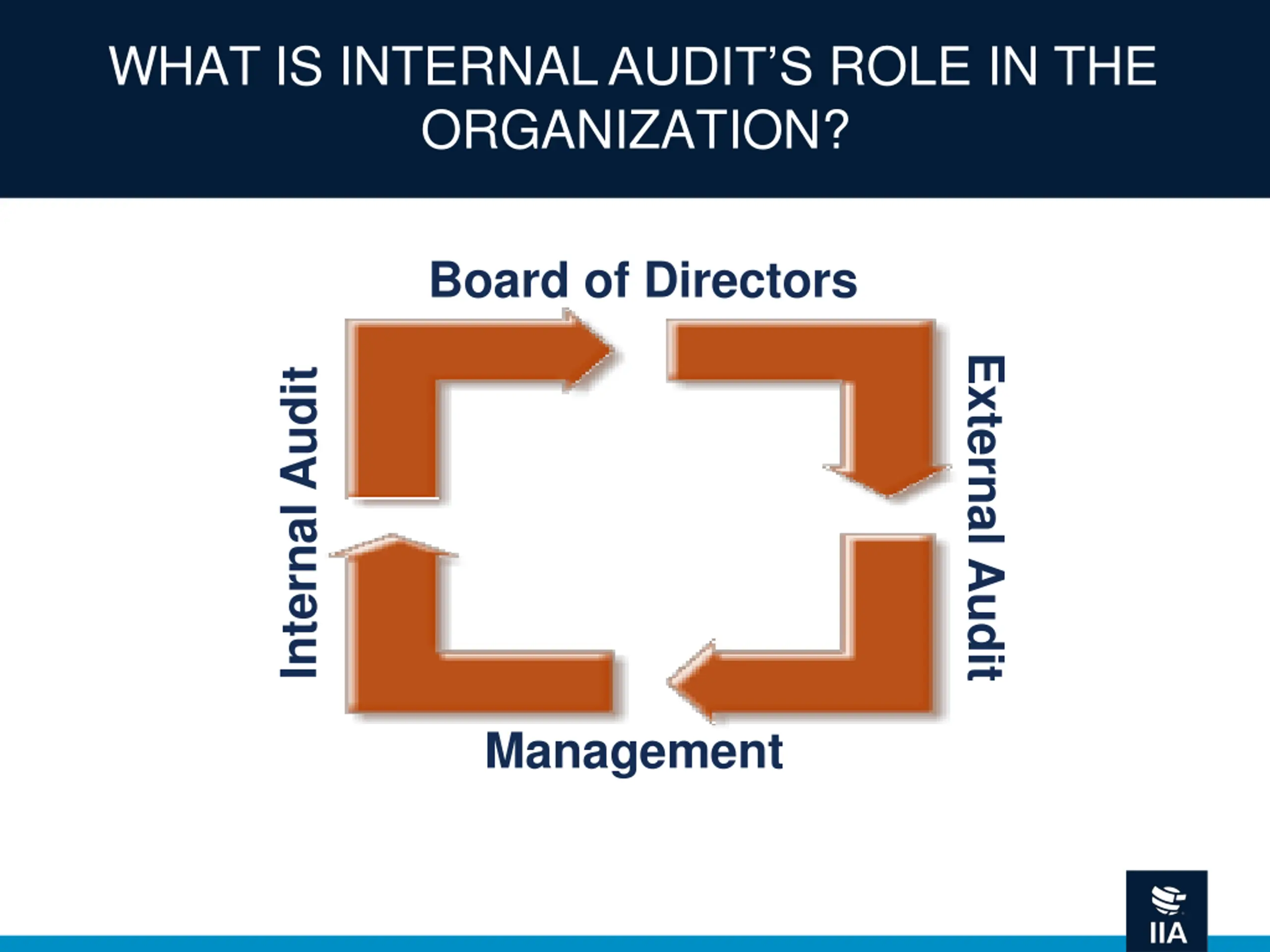 WHAT IS INTERNAL AUDITS ROLE IN THE ORGANIZATION? Board of Directors External Audit Internal Audit Management