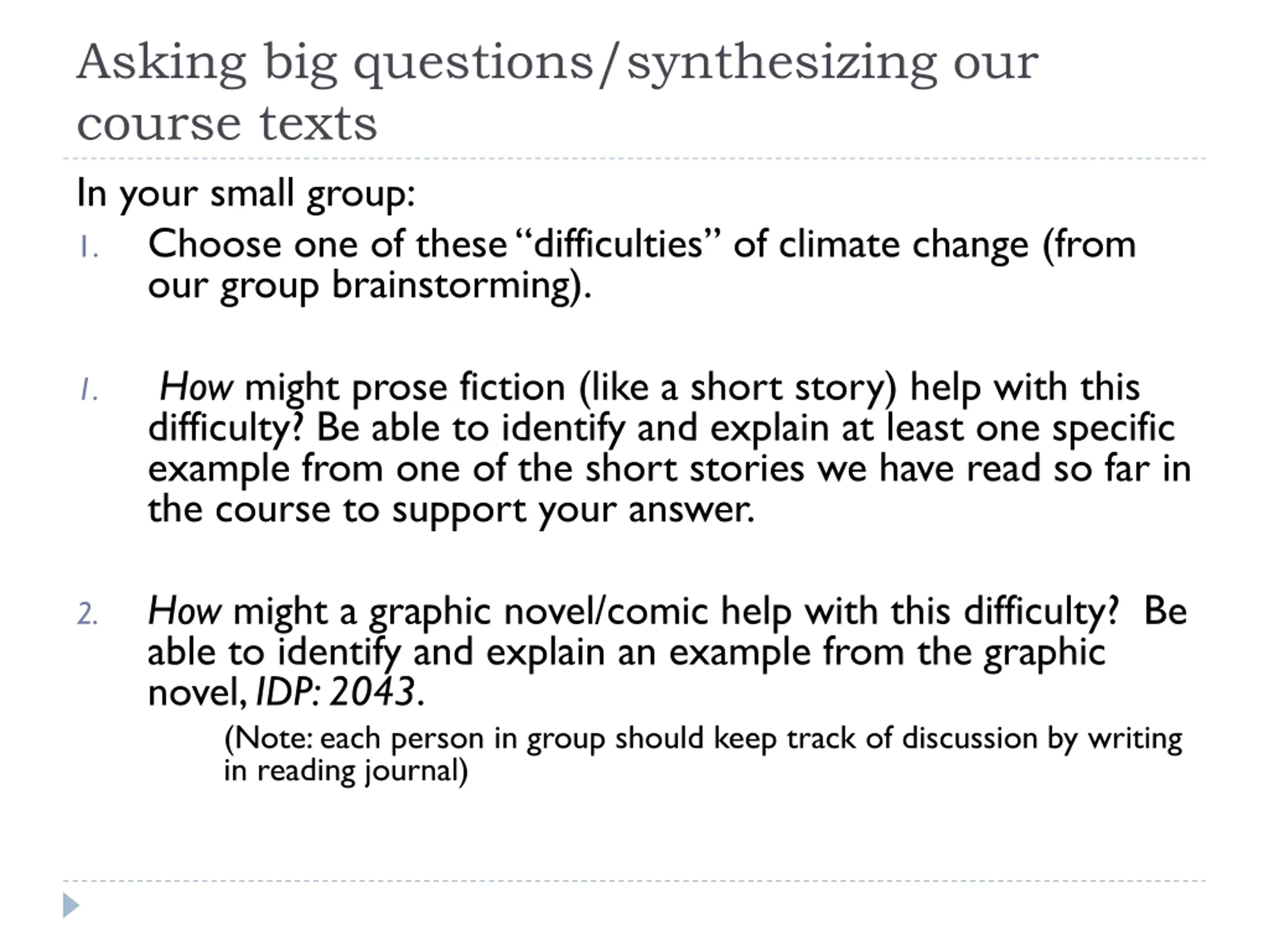 Asking big questions/synthesizing our course texts In your small group: 1. Choose one of these difficulties of climate change (from our group brainstorming). How might prose fiction (like a short story) help with this difficulty? Be able to identify and explain at least one specific example from one of the short stories we have read so far in the course to support your answer. 1. How might a graphic novel/comic help with this difficulty? Be able to identify and explain an example from the graphic novel, IDP: 2043. (Note: each person in group should keep track of discussion by writing in reading journal) 2.