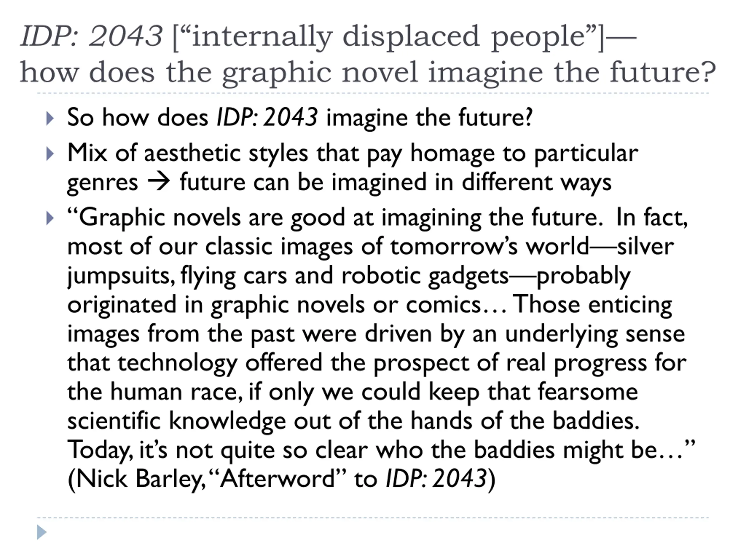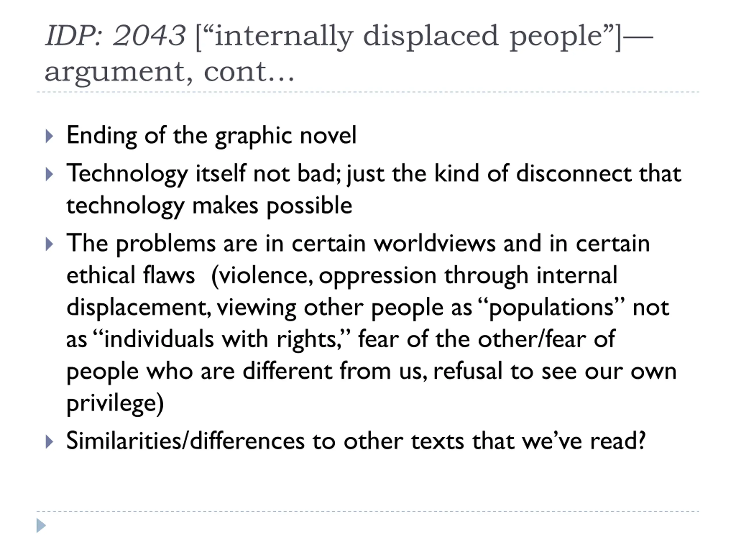 IDP: 2043 [internally displaced people] argument, cont Ending of the graphic novel Technology itself not bad; just the kind of disconnect that technology makes possible The problems are in certain worldviews and in certain ethical flaws (violence, oppression through internal displacement, viewing other people as populations not as individuals with rights, fear of the other/fear of people who are different from us, refusal to see our own privilege) Similarities/differences to other texts that we ve read?