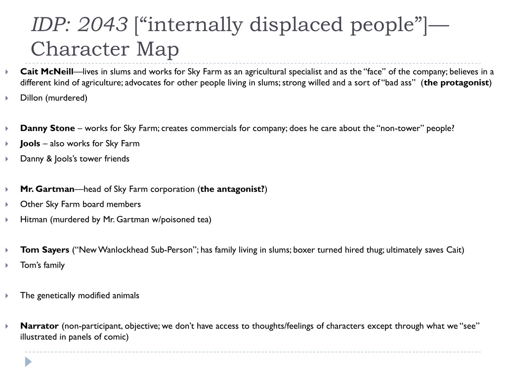 IDP: 2043 [internally displaced people] Character Map Cait McNeill lives in slums and works for Sky Farm as an agricultural specialist and as the face of the company; believes in a different kind of agriculture; advocates for other people living in slums; strong willed and a sort of bad ass (the protagonist) Dillon (murdered) Danny Stone works for Sky Farm; creates commercials for company; does he care about the non-tower people? Jools also works for Sky Farm Danny & Jools s tower friends Mr. Gartman head of Sky Farm corporation (the antagonist?) Other Sky Farm board members Hitman (murdered by Mr. Gartman w/poisoned tea) Tom Sayers ( New Wanlockhead Sub-Person ; has family living in slums; boxer turned hired thug; ultimately saves Cait) Tom s family The genetically modified animals Narrator (non-participant, objective; we don t have access to thoughts/feelings of characters except through what we see illustrated in panels of comic)