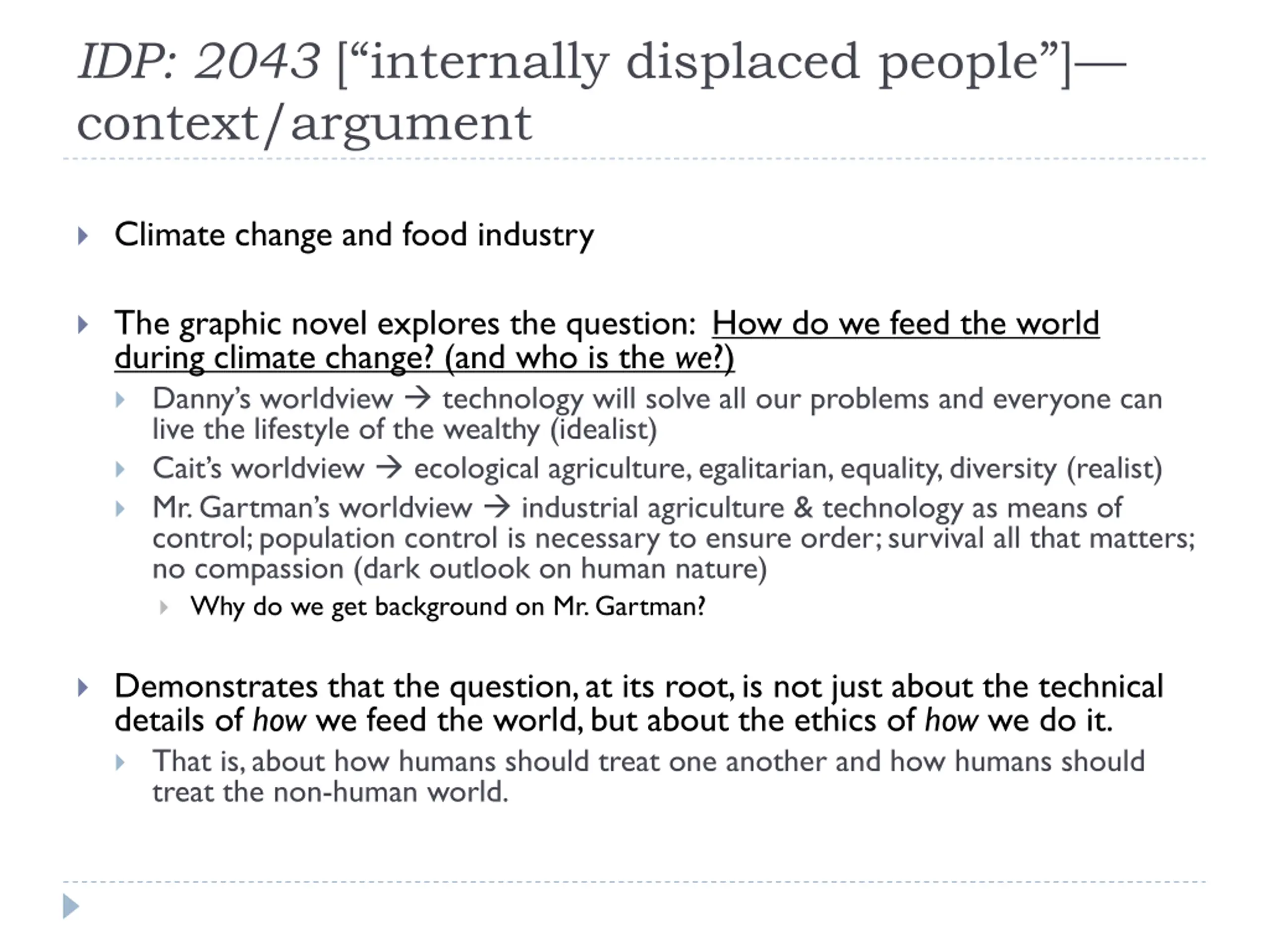 IDP: 2043 [internally displaced people] context/argument Climate change and food industry The graphic novel explores the question: How do we feed the world during climate change? (and who is the we?) Danny s worldview technology will solve all our problems and everyone can live the lifestyle of the wealthy (idealist) Cait s worldview ecological agriculture, egalitarian, equality, diversity (realist) Mr. Gartman s worldview industrial agriculture & technology as means of control; population control is necessary to ensure order; survival all that matters; no compassion (dark outlook on human nature) Why do we get background on Mr. Gartman? Demonstrates that the question, at its root, is not just about the technical details of how we feed the world, but about the ethics of how we do it. That is, about how humans should treat one another and how humans should treat the non-human world.