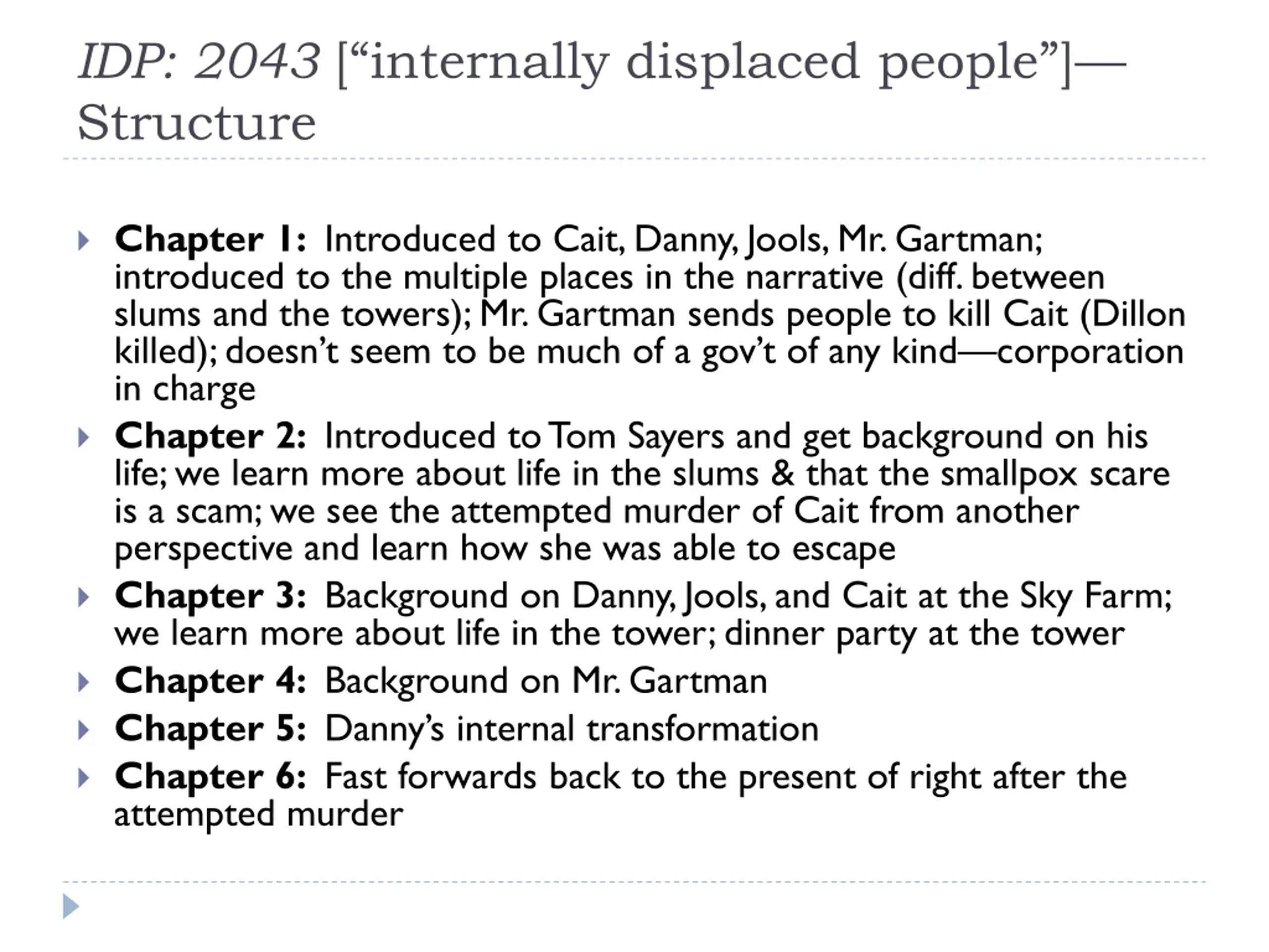 IDP: 2043 [internally displaced people] Structure Chapter 1: Introduced to Cait, Danny, Jools, Mr. Gartman; introduced to the multiple places in the narrative (diff. between slums and the towers); Mr. Gartman sends people to kill Cait (Dillon killed); doesn t seem to be much of a gov t of any kind corporation in charge Chapter 2: Introduced to Tom Sayers and get background on his life; we learn more about life in the slums & that the smallpox scare is a scam; we see the attempted murder of Cait from another perspective and learn how she was able to escape Chapter 3: Background on Danny, Jools, and Cait at the Sky Farm; we learn more about life in the tower; dinner party at the tower Chapter 4: Background on Mr. Gartman Chapter 5: Danny s internal transformation Chapter 6: Fast forwards back to the present of right after the attempted murder