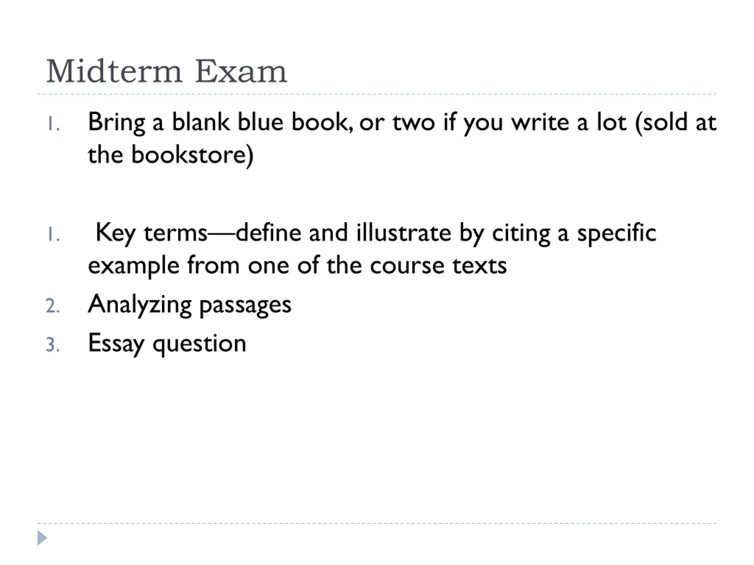 Midterm Exam Bring a blank blue book, or two if you write a lot (sold at the bookstore) 1. Key terms define and illustrate by citing a specific example from one of the course texts Analyzing passages Essay question 1. 2. 3.