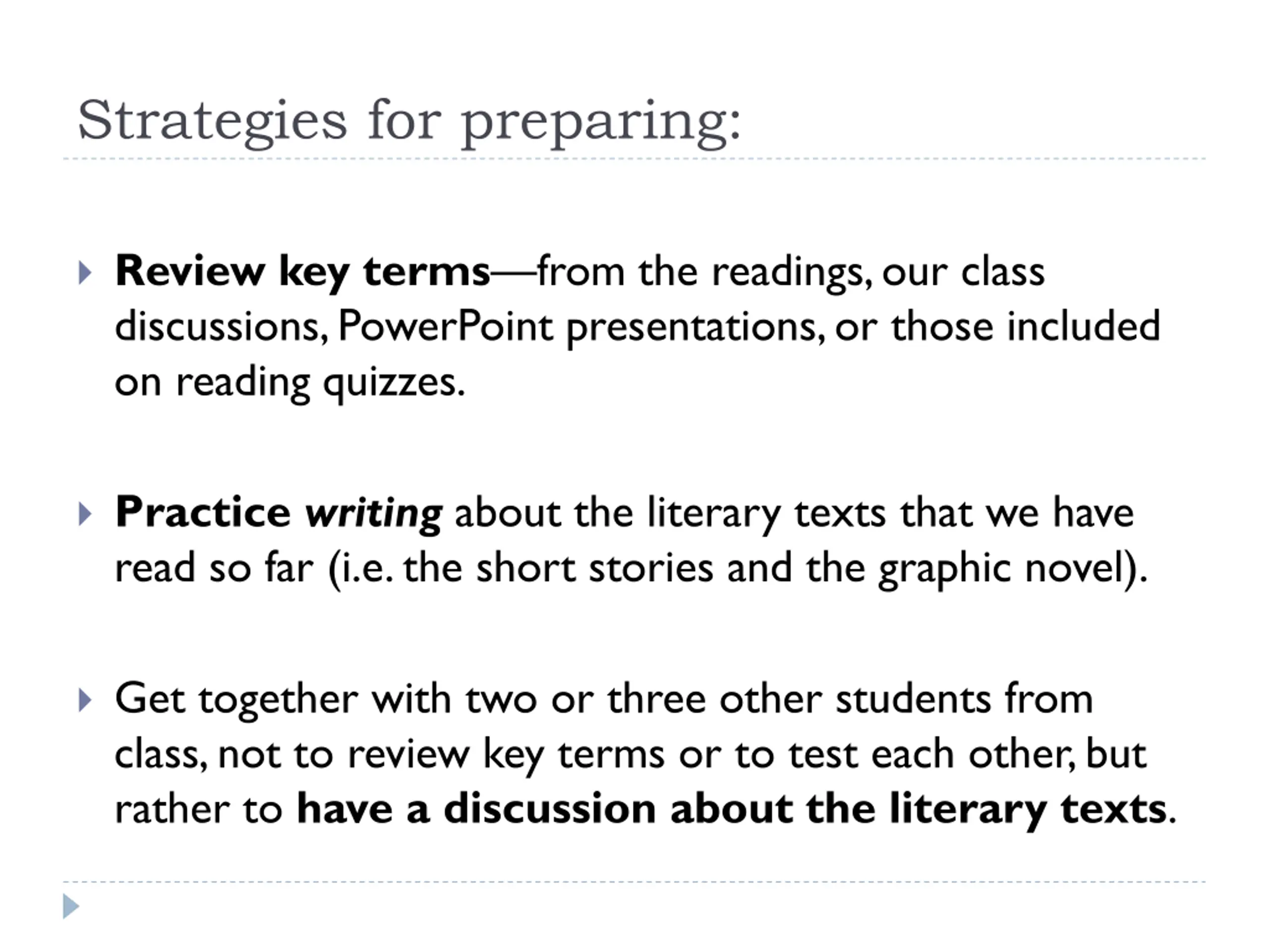 Strategies for preparing: Review key terms from the readings, our class discussions, PowerPoint presentations, or those included on reading quizzes. Practice writing about the literary texts that we have read so far (i.e. the short stories and the graphic novel). Get together with two or three other students from class, not to review key terms or to test each other, but rather to have a discussion about the literary texts.
