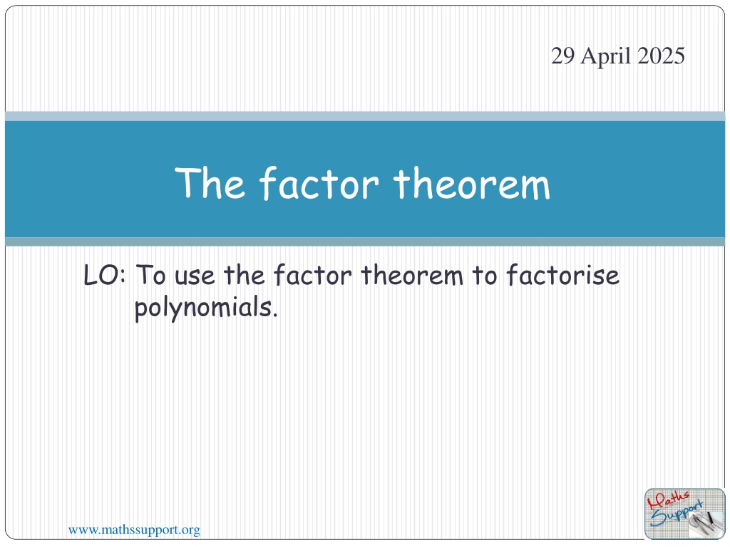 29 April 2025 The factor theorem LO: To use the factor theorem to factorise polynomials. www.mathssupport.org