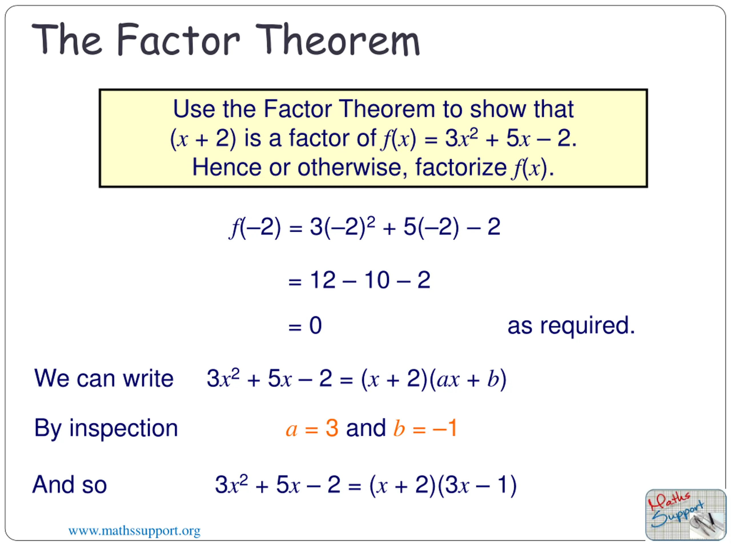 The Factor Theorem Use the Factor Theorem to show that (x + 2) is a factor of f(x) = 3x2 + 5x 2. Hence or otherwise, factorize f(x). f( 2) = 3( 2)2 + 5( 2) 2 = 12 10 2 = 0 as required. 3x2 + 5x 2 = (x + 2)(ax + b) We can write a = 3 and b = 1 By inspection 3x2 + 5x 2 = (x + 2)(3x 1) And so www.mathssupport.org