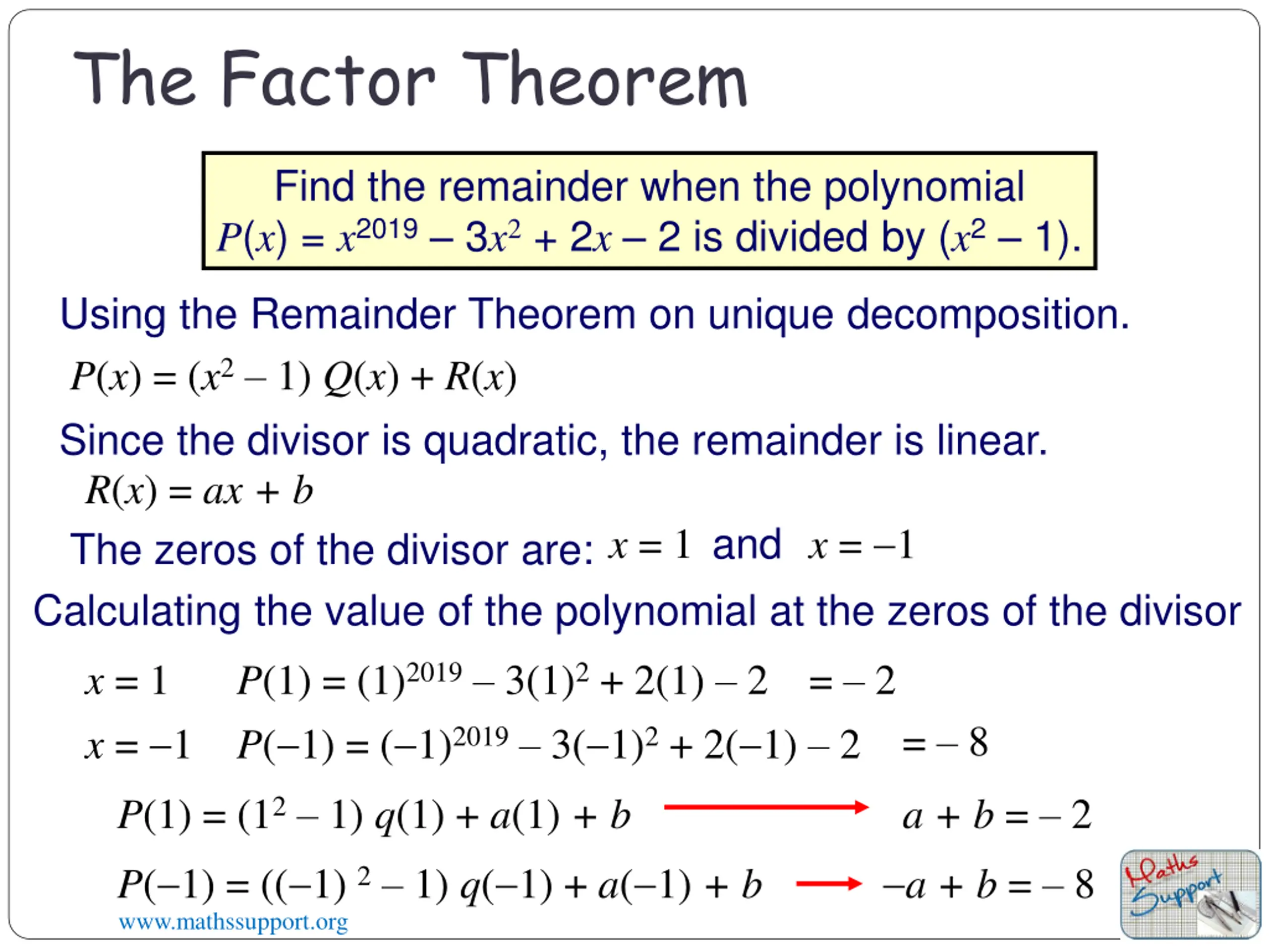 The Factor Theorem Find the remainder when the polynomial P(x) = x2019 3x2 + 2x 2 is divided by (x2 1). Using the Remainder Theorem on unique decomposition. P(x) = (x2 1) Q(x) + R(x) Since the divisor is quadratic, the remainder is linear. R(x) = ax + b The zeros of the divisor are:x = 1 Calculating the value of the polynomial at the zeros of the divisor x = 1 P(1) = (1)2019 3(1)2 + 2(1) 2 = 2 x = 1 P( 1) = ( 1)2019 3( 1)2 + 2( 1) 2 = 8 x = 1 and P(1) = (12 1) q(1) + a(1) + b P( 1) = (( 1) 2 1) q( 1) + a( 1) + b a+ b = 2 a+ b = 8 www.mathssupport.org
