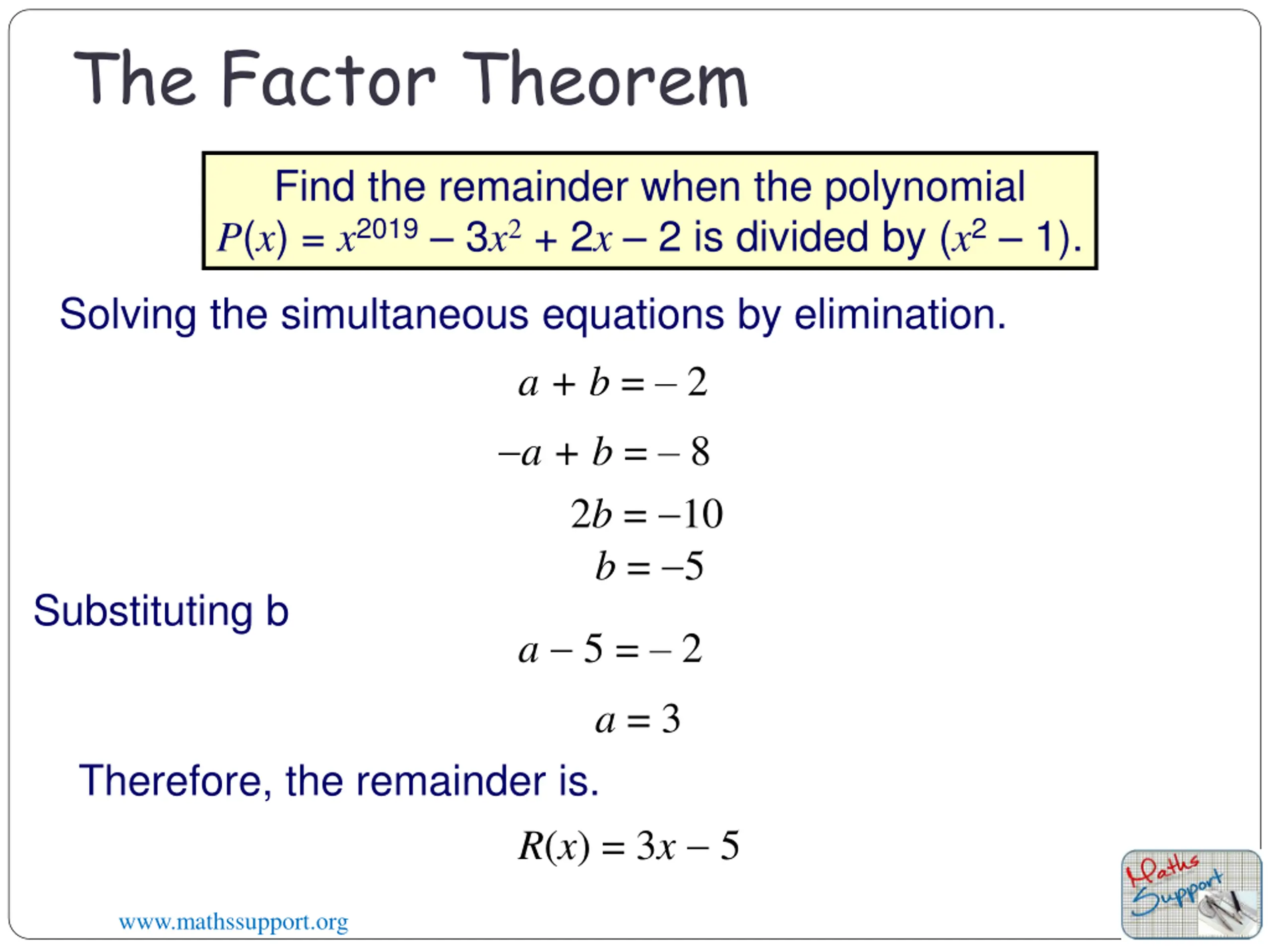 The Factor Theorem Find the remainder when the polynomial P(x) = x2019 3x2 + 2x 2 is divided by (x2 1). Solving the simultaneous equations by elimination. a+ b = 2 a+ b = 8 2b = 10 b = 5 Substituting b a 5= 2 a = 3 Therefore, the remainder is. R(x) = 3x 5 www.mathssupport.org