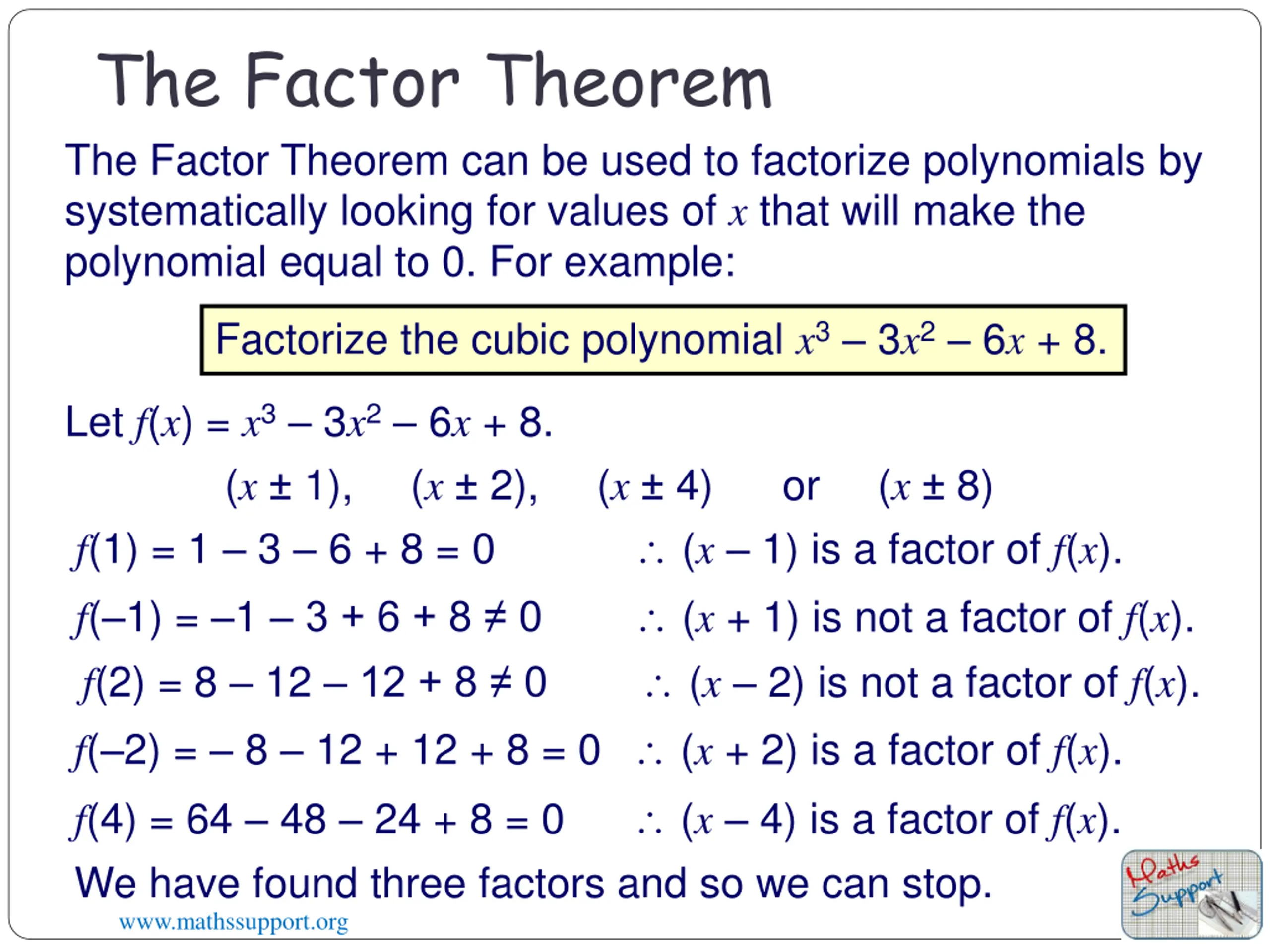 The Factor Theorem The Factor Theorem can be used to factorize polynomials by systematically looking for values of x that will make the polynomial equal to 0. For example: Factorize the cubic polynomial x3 3x2 6x + 8. Let f(x) = x3 3x2 6x + 8. (x 1), f(1) = 1 3 6 + 8 = 0 f( 1) = 1 3 + 6 + 8 0 f(2) = 8 12 12 + 8 0 f( 2) = 8 12 + 12 + 8 = 0 (x + 2) is a factor of f(x). f(4) = 64 48 24 + 8 = 0 We have found three factors and so we can stop. (x 2), (x 4) (x 1) is a factor of f(x). (x + 1) is not a factor of f(x). (x 2) is not a factor of f(x). (x 8) or (x 4) is a factor of f(x). www.mathssupport.org