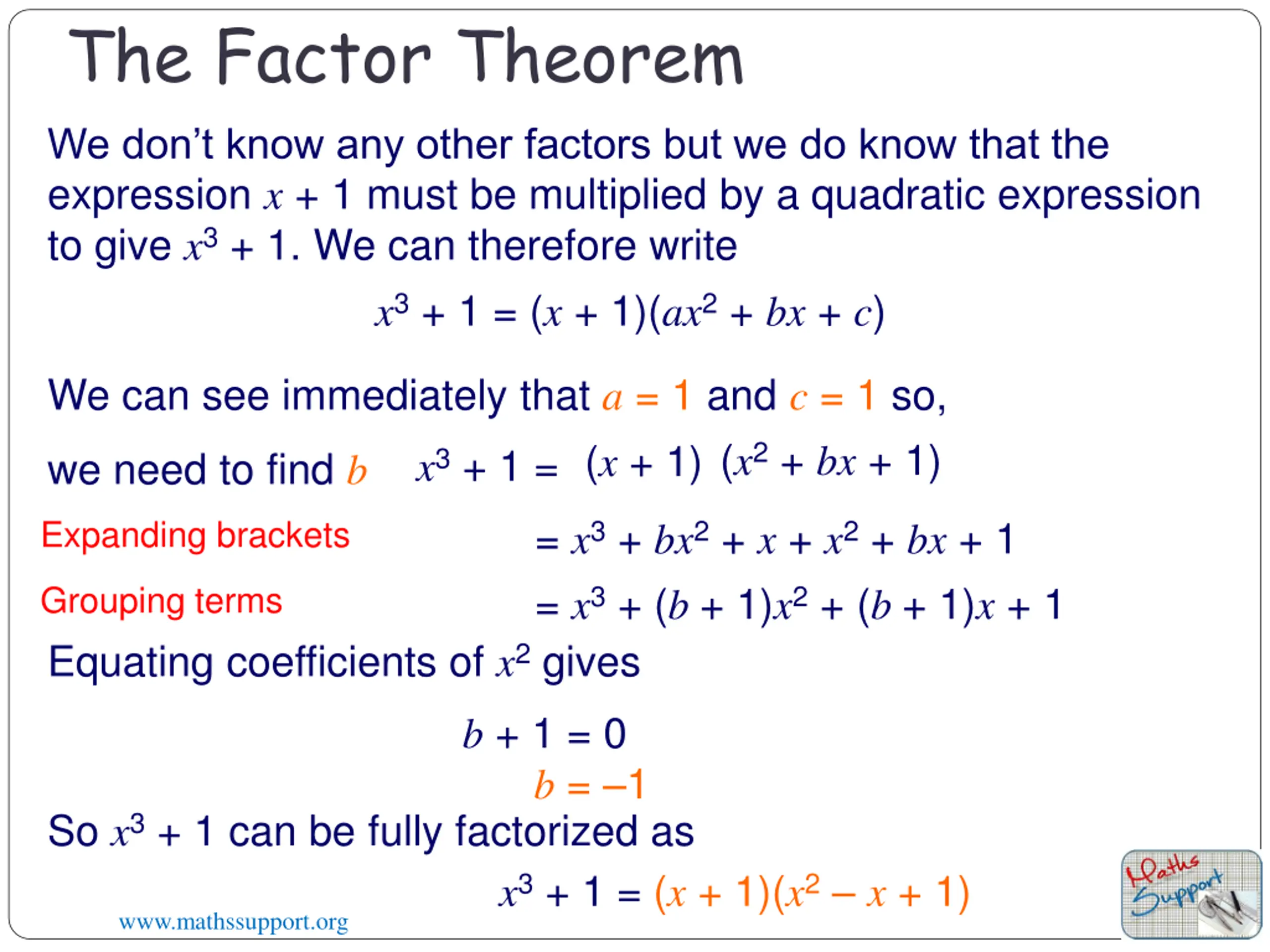 The Factor Theorem We don t know any other factors but we do know that the expression x + 1 must be multiplied by a quadratic expression to give x3 + 1. We can therefore write x3 + 1 = (x + 1)(ax2 + bx + c) We can see immediately that a = 1 and c = 1 so, (x + 1) (x2 + bx + 1) x3 + 1 = we need to find b = x3 + bx2 + x + x2 + bx + 1 = x3 + (b + 1)x2 + (b + 1)x + 1 Expanding brackets Grouping terms Equating coefficients of x2 gives b + 1 = 0 b = 1 So x3 + 1 can be fully factorized as x3 + 1 = (x + 1)(x2 x + 1) www.mathssupport.org