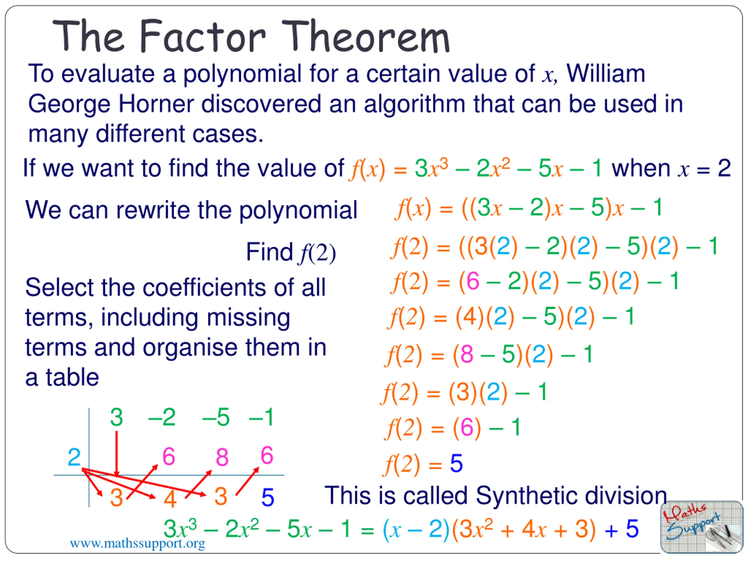 The Factor Theorem To evaluate a polynomial for a certain value of x, William George Horner discovered an algorithm that can be used in many different cases. If we want to find the value of f(x) = 3x3 2x2 5x 1 when x = 2 f(x) = ((3x 2)x 5)x 1 f(2) = ((3(2) 2)(2) 5)(2) 1 f(2) = (6 2)(2) 5)(2) 1 f(2) = (4)(2) 5)(2) 1 f(2) = (8 5)(2) 1 f(2) = (3)(2) 1 f(2) = (6) 1 f(2) = 5 This is called Synthetic division We can rewrite the polynomial Find f(2) Select the coefficients of all terms, including missing terms and organise them in a table 3 2 2 3 4 3x3 2x2 5x 1 = (x 2)(3x2 + 4x + 3) + 5 5 1 8 6 6 3 5 www.mathssupport.org