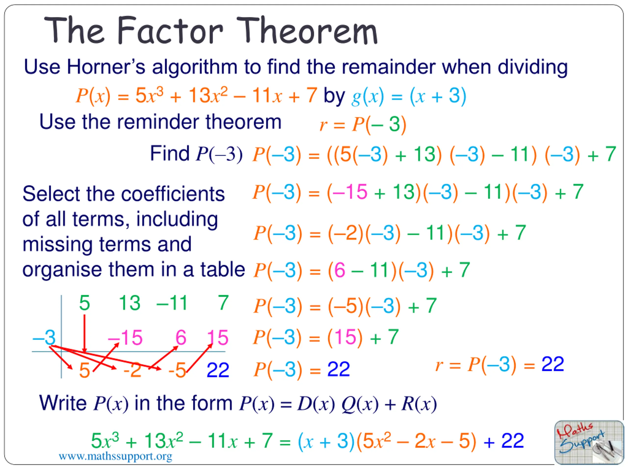 The Factor Theorem Use Horner s algorithm to find the remainder when dividing P(x) = 5x3 + 13x2 11x + 7 by g(x) = (x + 3) Use the reminder theorem P( 3) = ((5( 3) + 13) ( 3) 11) ( 3) + 7 FindP( 3) r = P( 3) P( 3) = ( 15 + 13)( 3) 11)( 3) + 7 Select the coefficients of all terms, including missing terms and organise them in a table 5 13 11 3 5 -2 Write P(x) in the form P(x) = D(x) Q(x) + R(x) P( 3) = ( 2)( 3) 11)( 3) + 7 P( 3) = (6 11)( 3) + 7 7 P( 3) = ( 5)( 3) + 7 P( 3) = (15) + 7 P( 3) = 22 6 15 15 r = P( 3) = 22 -5 22 5x3 + 13x2 11x + 7 = (x + 3)(5x2 2x 5) + 22 www.mathssupport.org