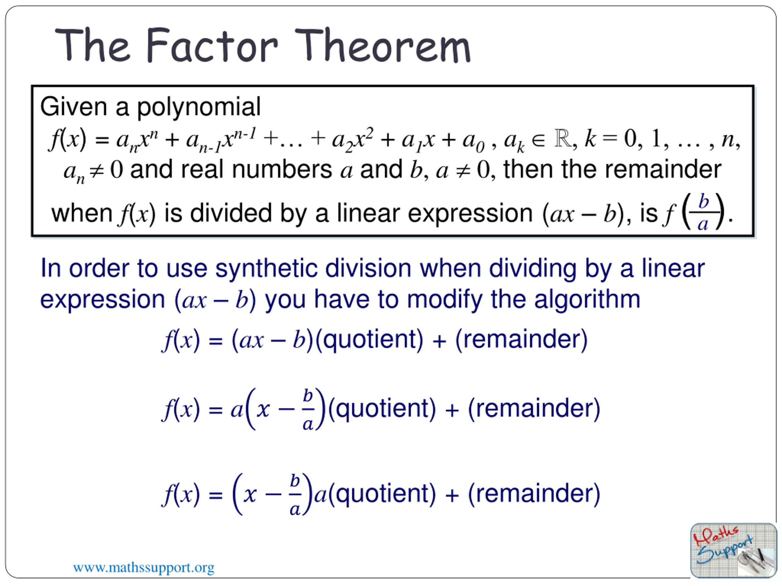 The Factor Theorem Given a polynomial f(x) = anxn + an-1xn-1+ + a2x2 + a1x + a0 , ak , k= 0, 1, , n, an 0 and real numbers aandb, a 0, then the remainder when f(x) is divided by a linear expression (ax b), is f (). b a In order to use synthetic division when dividing by a linear expression (ax b) you have to modify the algorithm f(x) = (ax b)(quotient) + (remainder) f(x) = a ? ? ?(quotient) + (remainder) f(x) = ? ? ?a(quotient) + (remainder) www.mathssupport.org