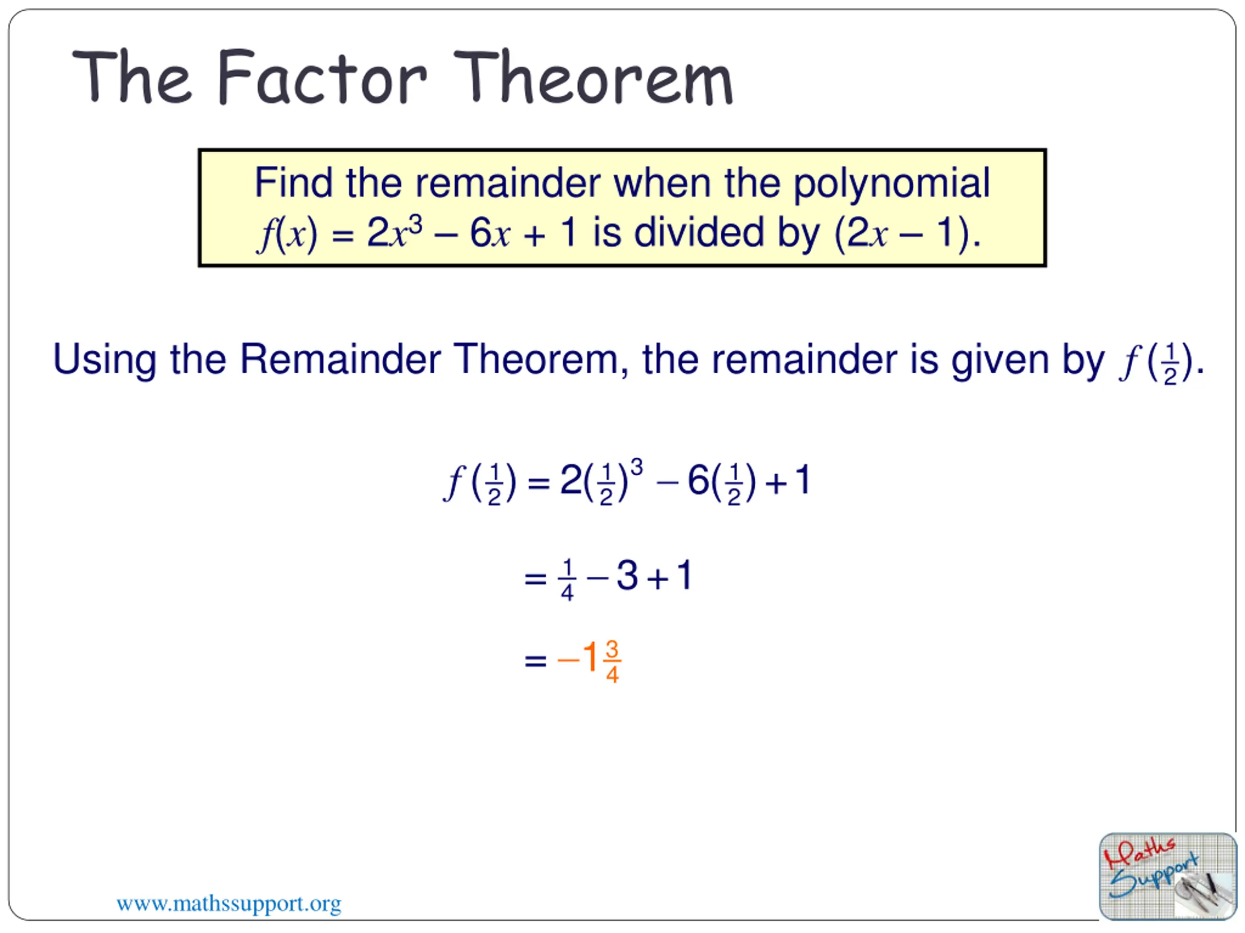 The Factor Theorem Find the remainder when the polynomial f(x) = 2x3 6x + 1 is divided by (2x 1). Using the Remainder Theorem, the remainder is given by 2( ). f 1 3 ( )= 2( ) 6( )+1 f 1 2 1 2 1 2 = 3+1 1 4 = 1 3 4 www.mathssupport.org