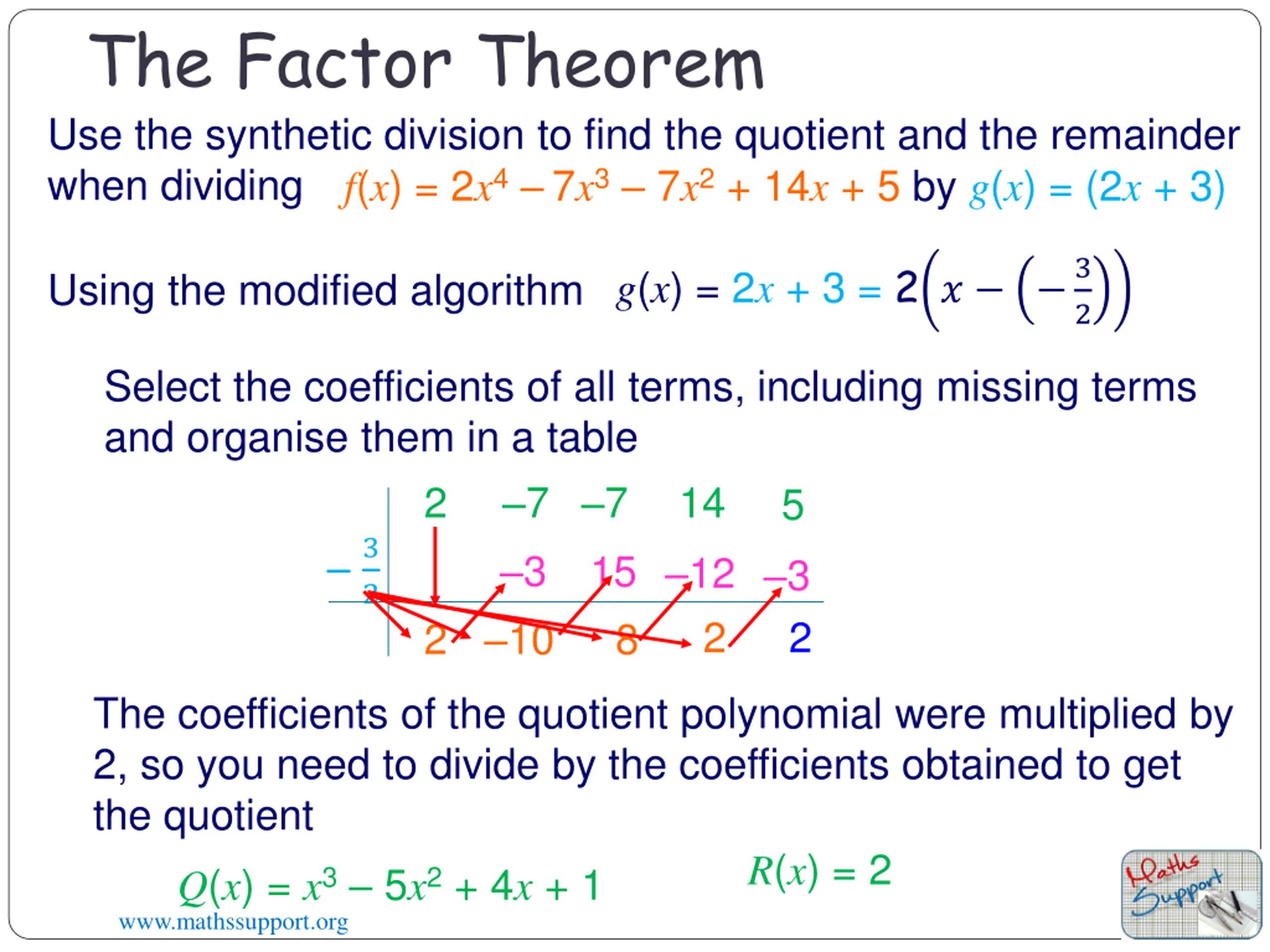 The Factor Theorem Use the synthetic division to find the quotient and the remainder when dividing f(x) = 2x4 7x3 7x2 + 14x + 5 by g(x) = (2x + 3) g(x) = 2x + 3 = 2 ? 3 Using the modified algorithm 2 Select the coefficients of all terms, including missing terms and organise them in a table 2 7 7 3 2 2 10 8 14 5 3 15 12 3 2 2 The coefficients of the quotient polynomial were multiplied by 2, so you need to divide by the coefficients obtained to get the quotient Q(x) = x3 5x2 + 4x + 1 R(x) = 2 www.mathssupport.org