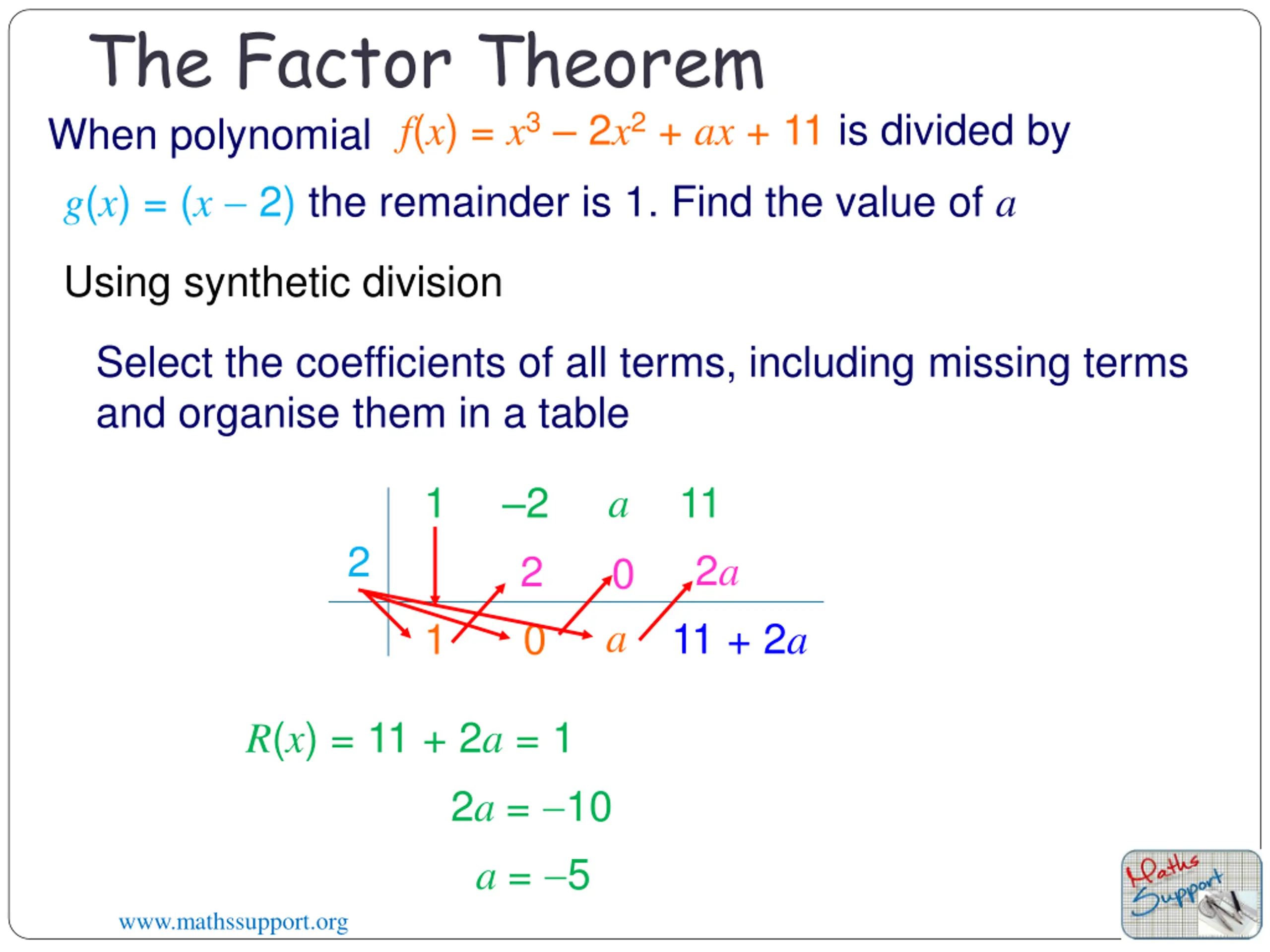 The Factor Theorem When polynomial f(x) = x3 2x2 + ax + 11 is divided by g(x) = (x 2) the remainder is 1. Find the value of a Using synthetic division Select the coefficients of all terms, including missing terms and organise them in a table 1 2 2 11 2a a 2 0 11 + 2a a 1 0 R(x) = 11 + 2a = 1 2a = 10 a = 5 www.mathssupport.org