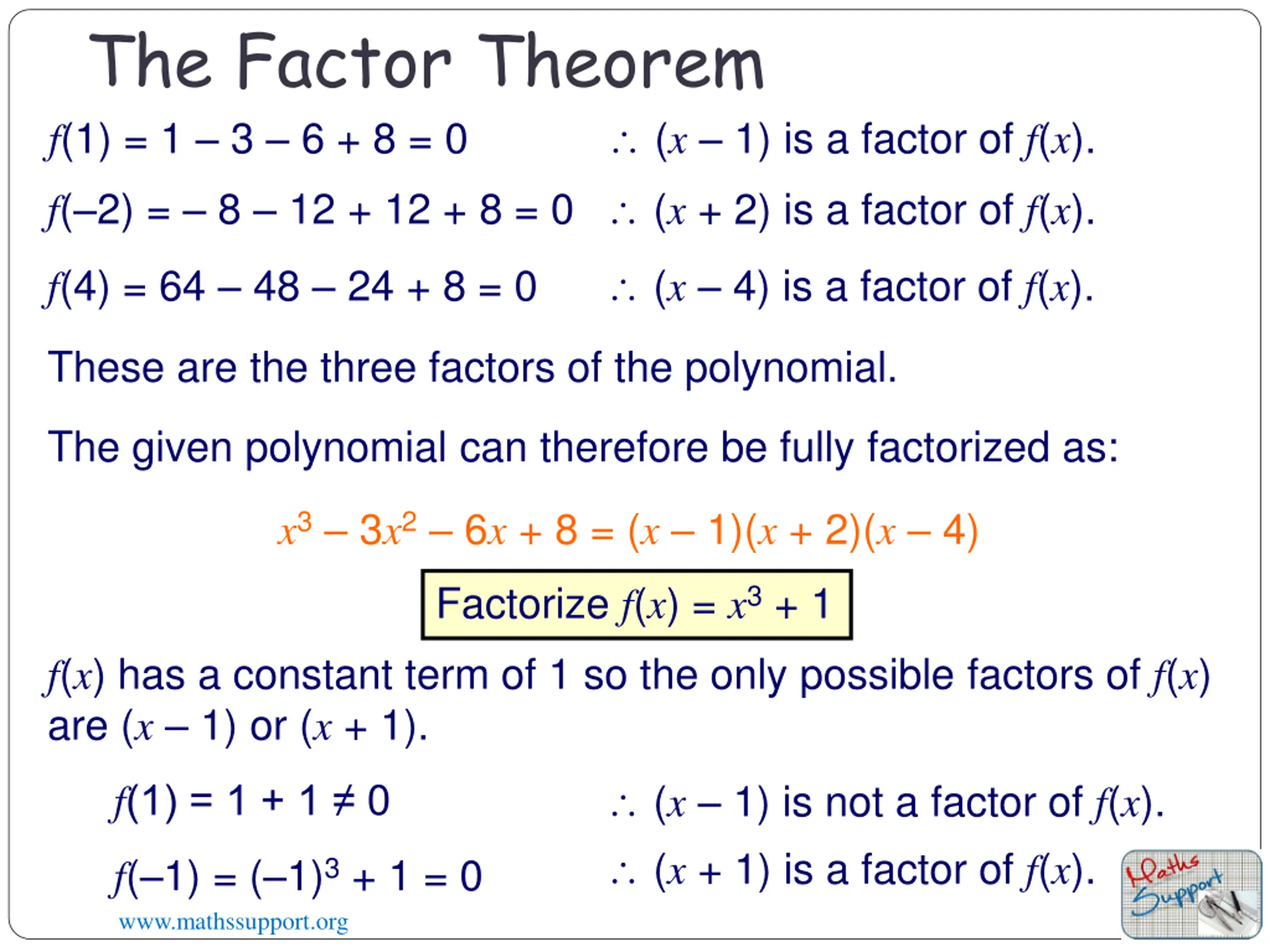 The Factor Theorem f(1) = 1 3 6 + 8 = 0 (x 1) is a factor of f(x). f( 2) = 8 12 + 12 + 8 = 0 (x + 2) is a factor of f(x). (x 4) is a factor of f(x). f(4) = 64 48 24 + 8 = 0 These are the three factors of the polynomial. The given polynomial can therefore be fully factorized as: x3 3x2 6x + 8 = (x 1)(x + 2)(x 4) Factorize f(x) = x3 + 1 f(x) has a constant term of 1 so the only possible factors of f(x) are (x 1) or (x + 1). (x 1) is not a factor of f(x). (x + 1) is a factor of f(x). f(1) = 1 + 1 0 f( 1) = ( 1)3 + 1 = 0 www.mathssupport.org