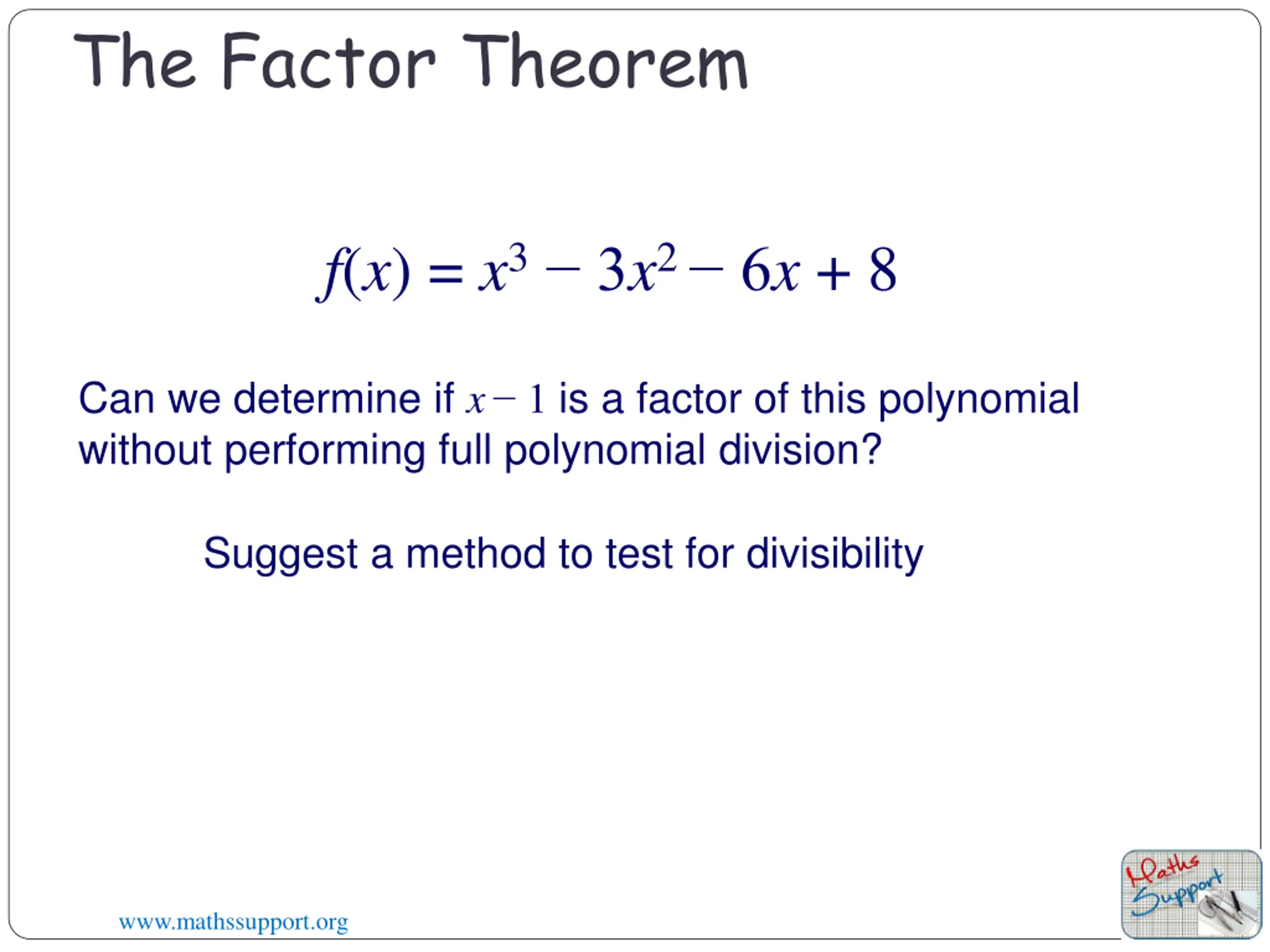 The Factor Theorem f(x) = x3 3x2 6x + 8 Can we determine if x 1is a factor of this polynomial without performing full polynomial division? Suggest a method to test for divisibility www.mathssupport.org