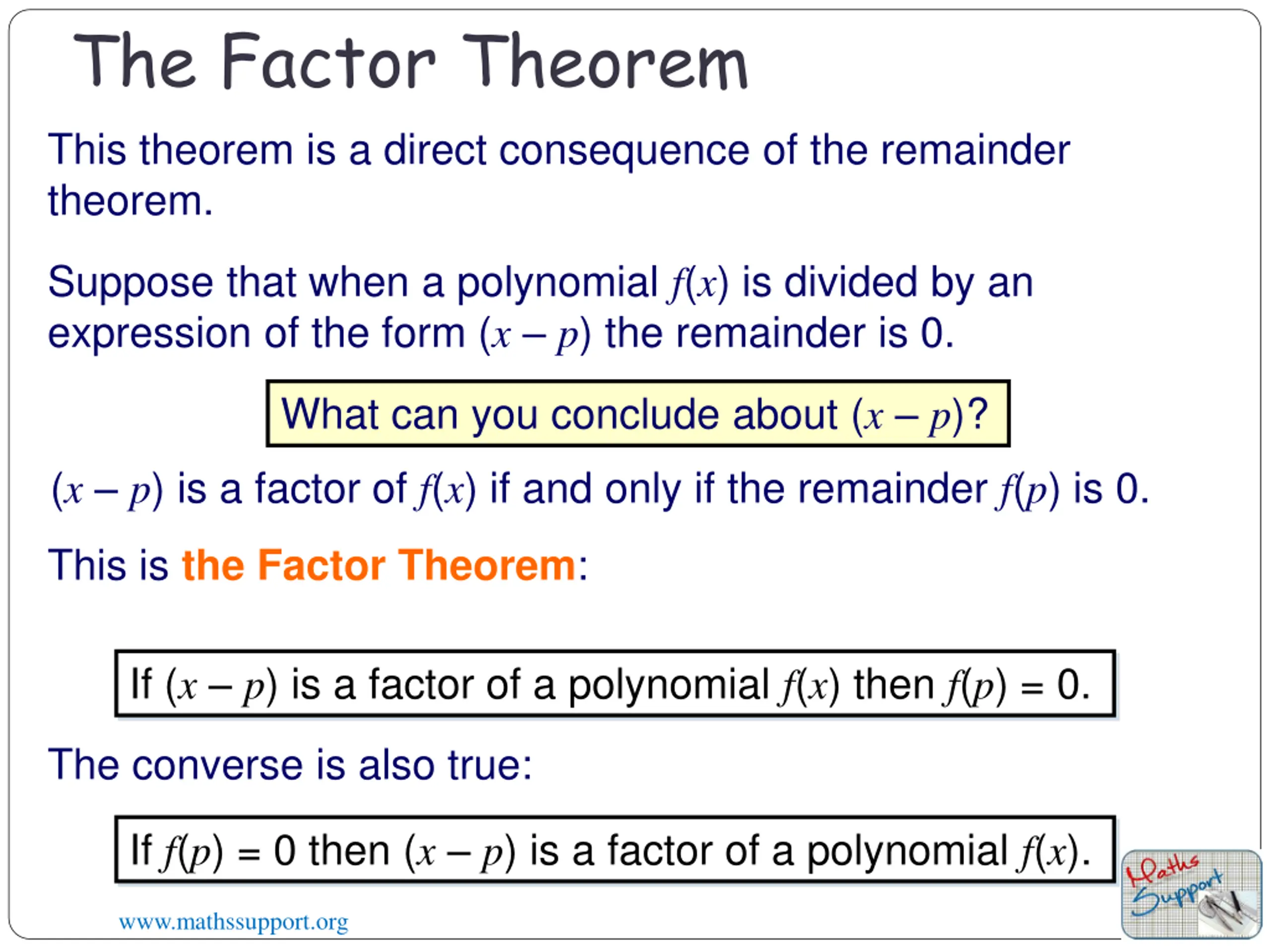 The Factor Theorem This theorem is a direct consequence of the remainder theorem. Suppose that when a polynomial f(x) is divided by an expression of the form (x p) the remainder is 0. What can you conclude about (x p)? (x p) is a factor of f(x) if and only if the remainder f(p) is 0. This is the Factor Theorem: If (x p) is a factor of a polynomial f(x) then f(p) = 0. The converse is also true: If f(p) = 0 then (x p) is a factor of a polynomial f(x). www.mathssupport.org