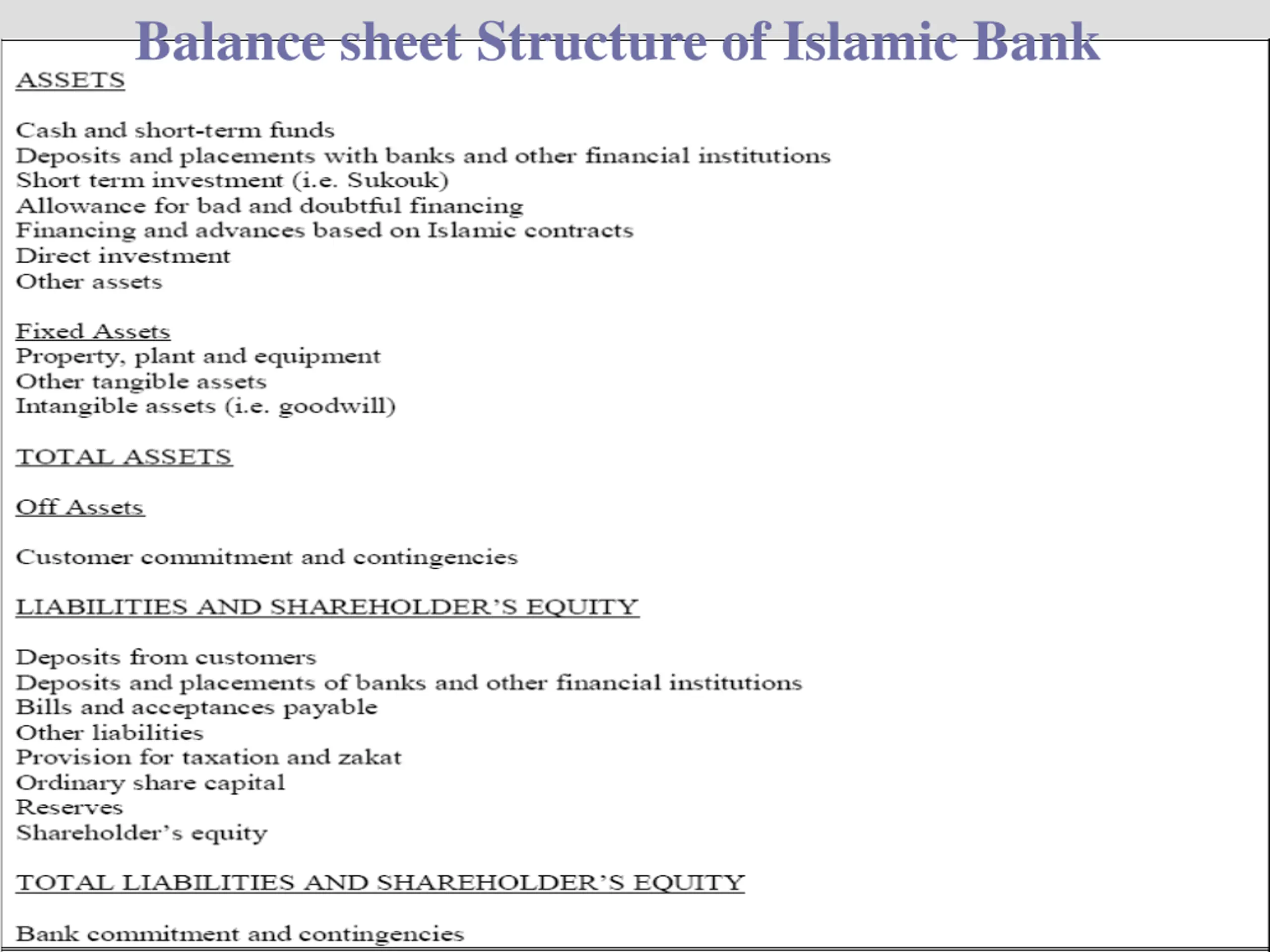 High liquid Assets: Sukuk, Mousharekah Certificates (PLS), Mousharekah Bound(Oragh- e-moshrehkah) Accounts and Notes receivable: Repurchase of debts (Kharid-e-Dayn) contraction. Financing and advances based on Islamic contracts: Mudarabah & Moshrekah Finacing, Gharzolhasaneh