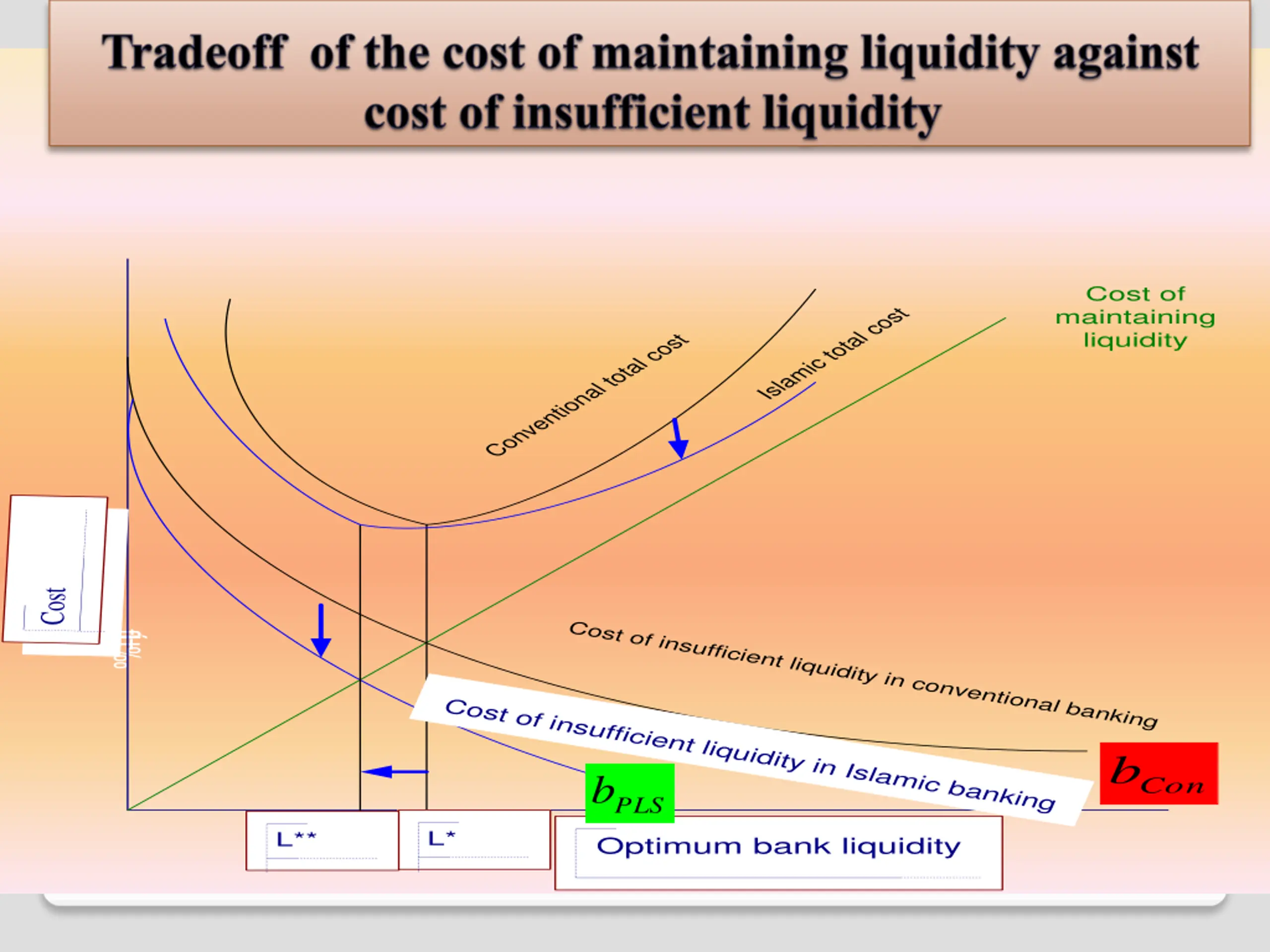 Cost of maintaining liquidity Islamic total cost Conventional total cost Cost Cost of insufficient liquidity in conventional banking Cost of insufficient liquidity in Islamic banking PLS b Con b L* L** Optimum bank liquidity