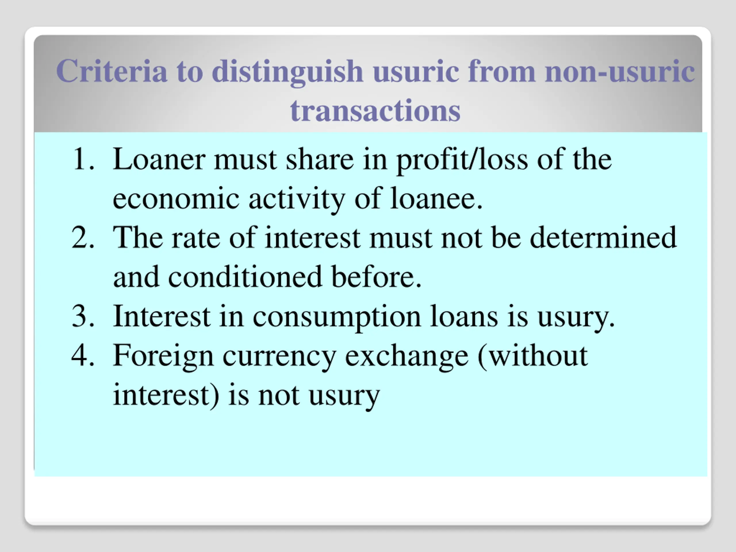 Criteria to distinguish usuric from non-usuric transactions 1. Loaner must share in profit/loss of the economic activity of loanee. 2. The rate of interest must not be determined and conditioned before. 3. Interest in consumption loans is usury. 4. Foreign currency exchange (without interest) is not usury