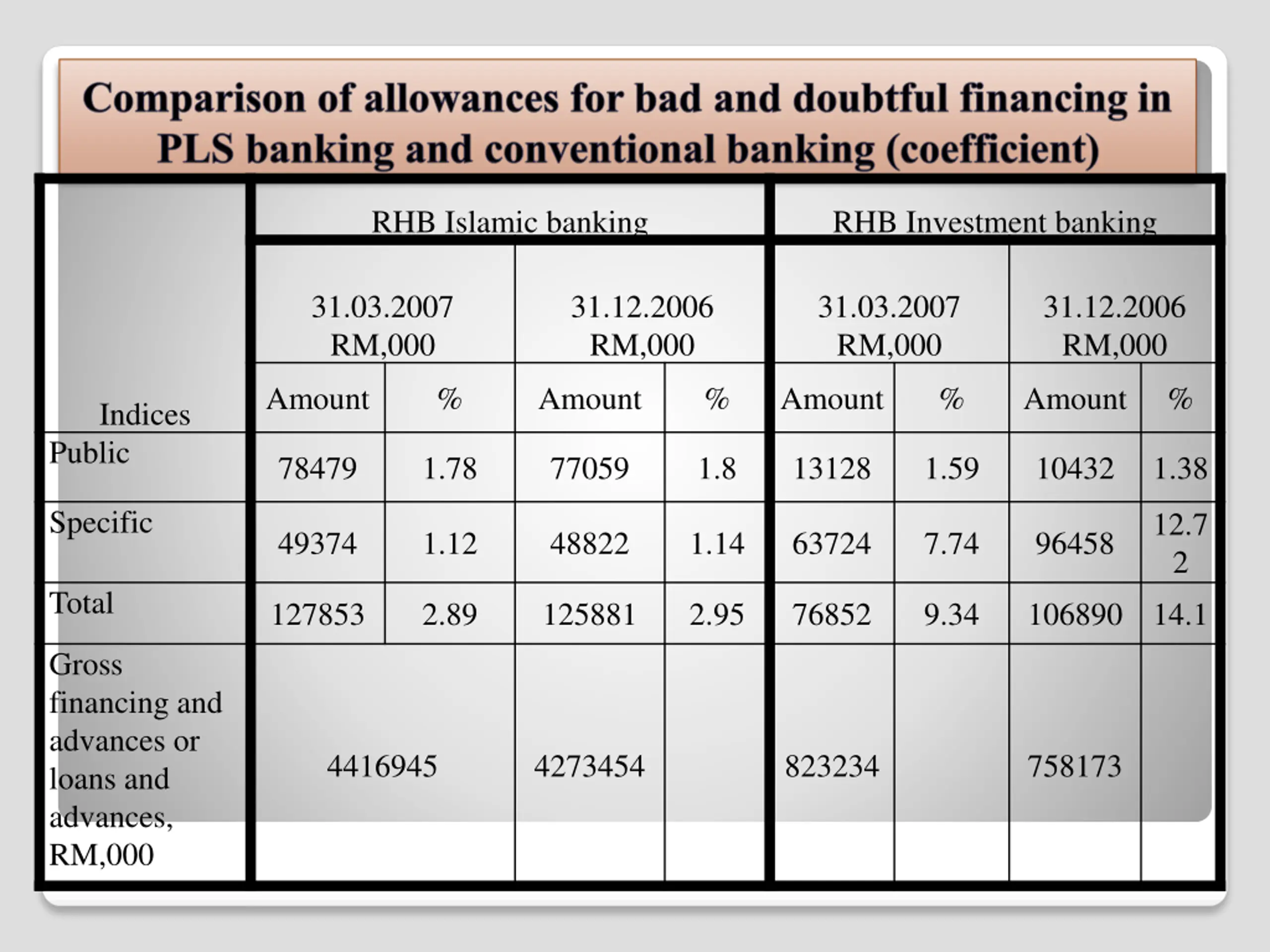 RHB Islamic banking RHB Investment banking 31.03.2007 RM,000 31.12.2006 RM,000 31.03.2007 RM,000 31.12.2006 RM,000 Amount % Amount % Amount % Amount % Indices Public 78479 1.78 77059 1.8 13128 1.59 10432 1.38 Specific 12.7 2 49374 1.12 48822 1.14 63724 7.74 96458 Total 127853 2.89 125881 2.95 76852 9.34 106890 14.1 Gross financing and advances or loans and advances, RM,000 4416945 4273454 823234 758173